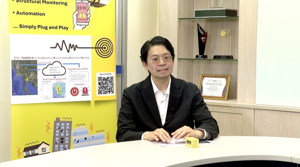 ศูนย์เชี่ยวชาญเฉพาะทางด้านวิศวกรรมแผ่นดินไหวและการสั่นสะเทือน คณะวิศวกรรมศาสตร์ จุฬาลงกรณ์มหาวิทยาลัยนำเซนเซอร์แจ้งเตือนระดับความรุนแรงของแผ่นดินไหว “รู้ก่อน (RUGON)” จำนวน 10 ตัว มอบให้กรุงเทพมหานคร เพื่อนำไปติดตั้งในอาคารโรงเรียนในสังกัด พร้อมเสริมองค์ความรู้เยาวชนรับมือแผ่นดินไหวศ.ดร.อาณัติ เรืองรัศมี ภาควิชาวิศวกรรมโยธา ศูนย์เชี่ยวชาญเฉพาะทางด้านวิศวกรรมแผ่นดินไหวและการสั่นสะเทือน คณะวิศวกรรมศาสตร์ จุฬาฯ เปิดเผยถึงที่มาของเซนเซอร์แจ้งเตือนระดับความรุนแรงของแผ่นดินไหว “รู้ก่อน (RUGON)” ว่า เนื่องจากเหตุการณ์แผ่นดินไหวมีผลกระทบต่อกรุงเทพมหานครในวงกว้าง แผ่นดินไหวจะมาถึงกรุงเทพมหานครด้วยความเร็วประมาณ 3 กิโลเมตรต่อวินาที หากเรารู้ล่วงหน้าหรือรู้ก่อนว่าจะมาถึงกรุงเทพฯ จะสามารถเตือนภัยล่วงหน้าได้ โดยเครื่องมือ“รู้ก่อน (RUGON)” จะถูกนำไปติดตั้งกระจายไปทั่วพื้นที่ และมีการพัฒนาเทคโนโลยีเพื่อทำให้เซนเซอร์ติดตั้งง่ายและทำงานอย่างมีเสถียรภาพศ.ดร.อาณัติเผยถึงการทำงานของเซนเซอร์ “รู้ก่อน” ว่าจะมีเครื่องมือวัดความเร่งอยู่ภายใน นำไปติดตั้งที่พื้นชั้นล่างอาคารหรือชั้นที่สูงขึ้นมา เพื่อหลีกเลี่ยงน้ำและความชื้น เมื่อเกิดการสั่นสะเทือน ตัวเซนเซอร์ก็จะส่งสัญญาณมาที่ระบบคลาวด์ จะรู้ว่าระยะห่างเท่าใด จะได้เตือนผู้ที่อยู่ระยะไกลได้ ซึ่งแรงสั่นสะเทือนนี้จะวัดในระดับที่ต่ำกว่าความรู้สึกที่คนจะรับรู้ได้ การวัดแรงสั่นสะเทือนใช้หน่วยความเร่งที่เรียกว่า “จี” (g) ในระดับ 1 ใน 1000 ซึ่งนอกจากใช้สำหรับแจ้งเตือนยังใช้วัดความแข็งแรงอาคารด้วย“ก่อนหน้านี้สิ่งที่เราทราบเวลาเกิดแผ่นดินไหวคือเราจะรู้ว่าศูนย์กลางอยู่ตรงไหน แต่กว่าจะรู้ต้องใช้เวลานาน ประมาณ 5-10 นาที การที่มีเซนเซอร์นี้ไปติดตั้งจะใช้เวลาแค่ 1-2 นาทีหลังจากเกิดเหตุการณ์แผ่นดินไหว ทำให้ภาครัฐใช้ในการบริหารจัดการภัยพิบัติจากแผ่นดินไหว ความรุนแรงกระจายไปอย่างไร แผนที่นี้เรียกว่า Live ShakeMap เป็นสิ่งที่เสริมขึ้นมาจากการที่ทำการเตือนภัย” ศ.ดร.อาณัติกล่าว