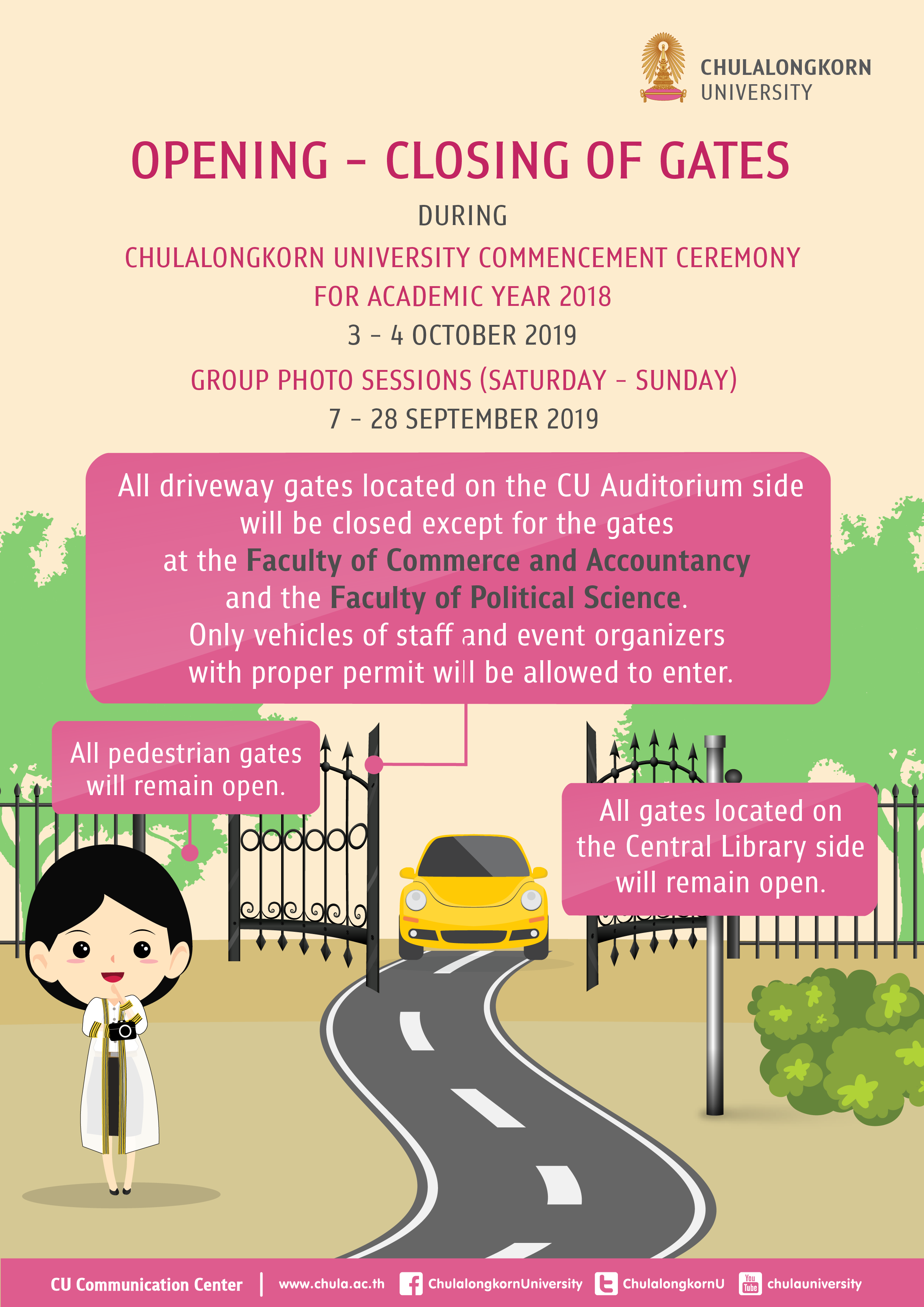 • All driveway gates on the CU Auditorium side will be closed, except for the gates at the Faculty of Commerce and Accountancy and the Faculty of Political Science, which will allow only vehicles with proper permit to enter. All pedestrian gates will remain open.
