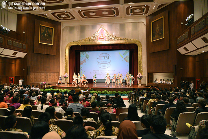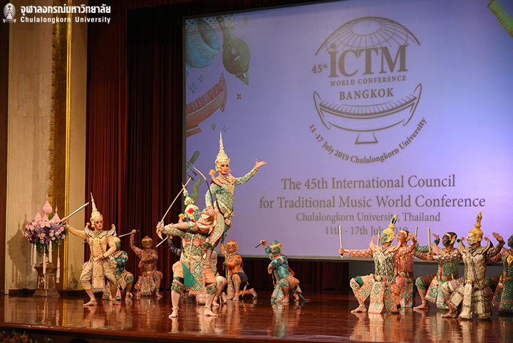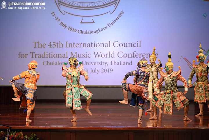 On this occasion, HRH Princess Maha Chakri Sirindhorn watched the Thai traditional Khon performance, an excerpt from the Ramayana. Following the performance were presentations on “70 Years of ICTM” by Prof. Salwa Castelo-Branco, President of the International Council of Traditional Music, and “The Journey of 45th ICTM World Conference in Bangkok Thailand” by Professor Dr. Bussakorn Binson, Dean of the Faculty of Fine and Applied Arts. The keynote speaker session was on “Transborder of Theories and Paradigm in Ethnomusicological Studies of Folk Music: Vision of Moh-lum in Mainland Southeast Asia”, given by Asst. Professor Charoenchai Chonpairoj from the College of Music, Mahasarakham University.