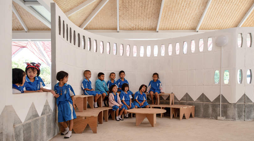The highlight of the project was the students’ exposure to social exchange, since the entire design team temporarily relocated from Bangkok to Dum Yai, Ubon Ratchathani, during the construction process. They spent time with the teachers, the school children, and the locals, creating a collaborative, intergenerational and international environment with a constant exchange of experience and knowledge.