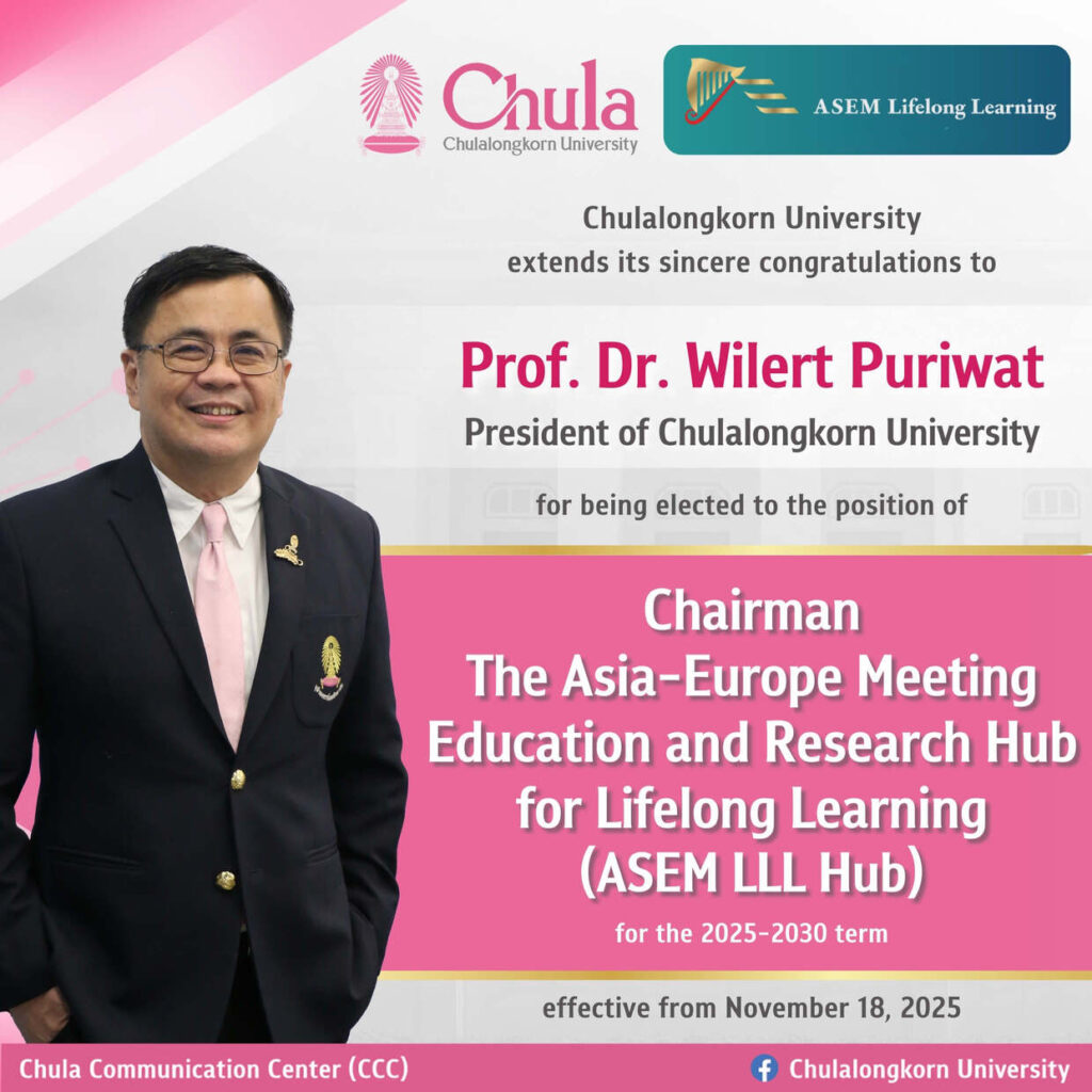 Professor Dr. Wilert Puriwat, President of Chulalongkorn University, has been elected to the prestigious position of Chair of the Asia-Europe Meeting Education and Research Hub for Lifelong Learning (ASEM LLL Hub) for the 2025–2030 term. His term will officially begin on November 18, 2025.