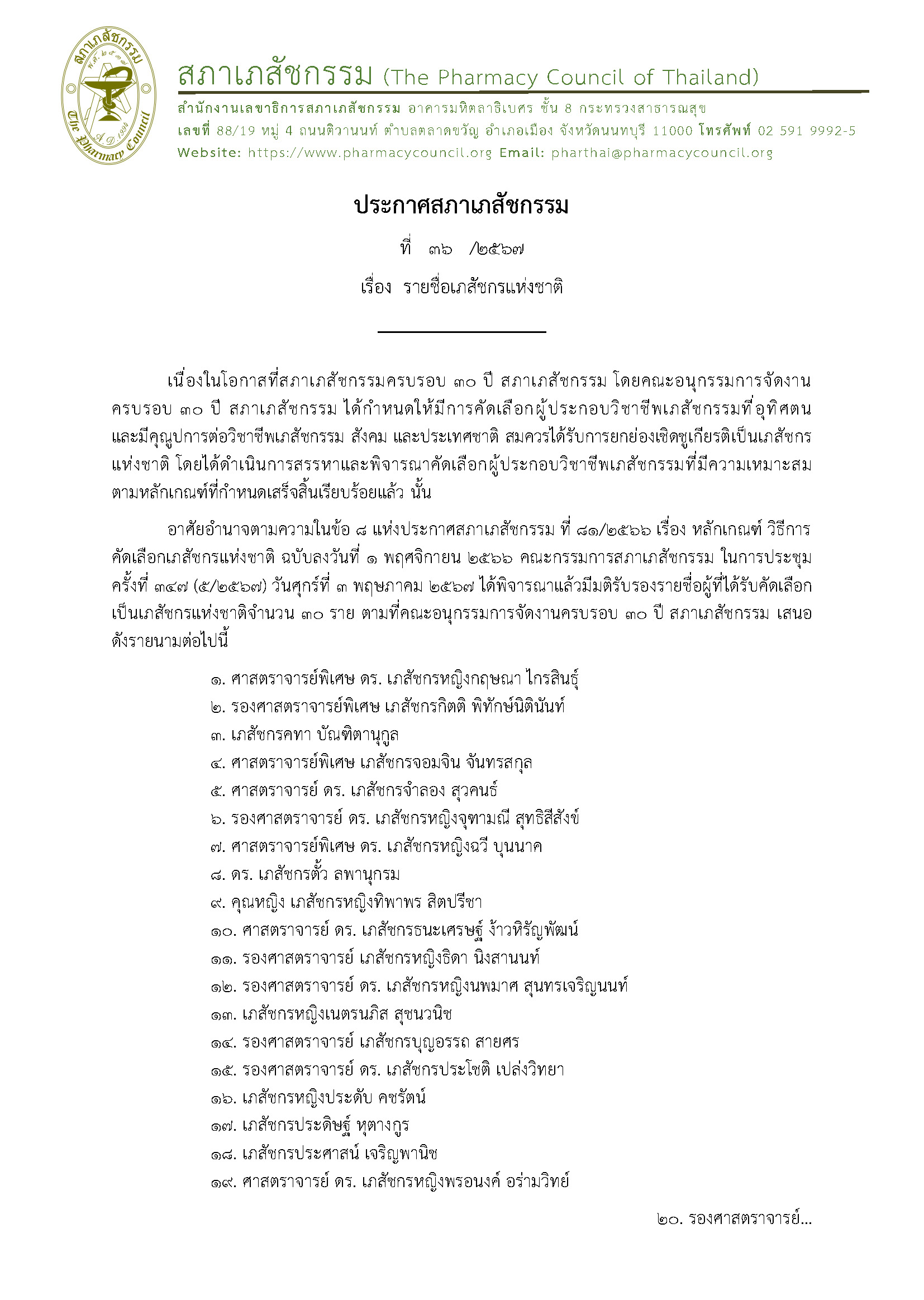 “เภสัชกรแห่งชาติ” เป็นรางวัลที่สภาเภสัชกรรมยกย่องเชิดชูเกียรติผู้ประกอบการวิชาชีพเภสัชกรรมที่อุทิศตนและมีคุณูปการต่อวิชาชีพเภสัชกรรม สังคม และประเทศชาติจำนวน 30 คน ซึ่งได้มาจากการเสนอชื่อและคัดเลือกจากผู้ขึ้นทะเบียนใบประกอบวิชาชีพเภสัชกรรมจำนวน 50,789 คน