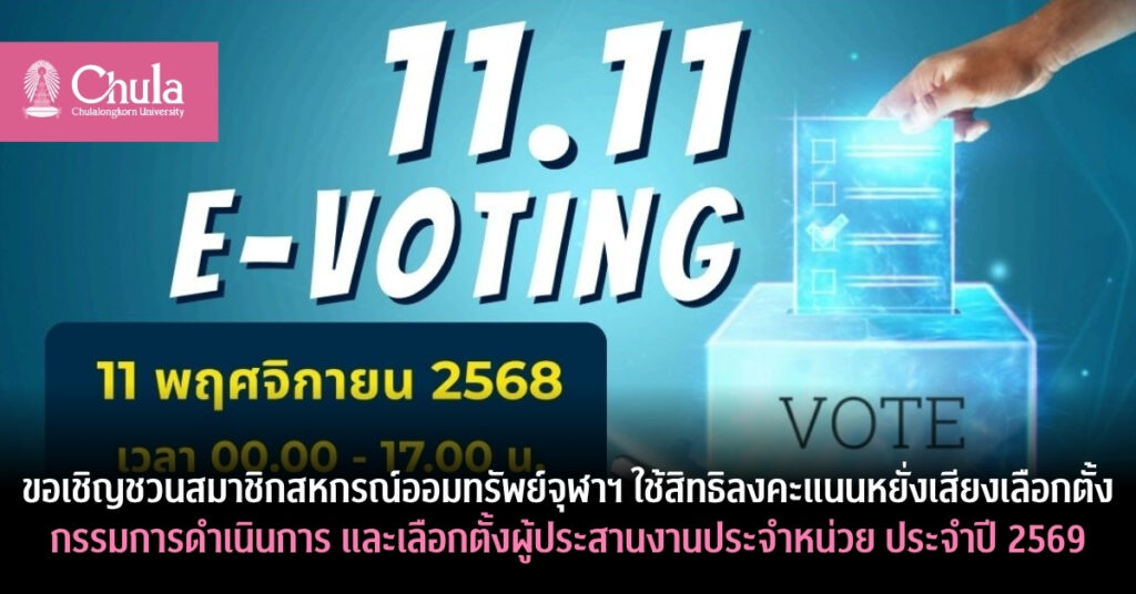 ขอเชิญสมาชิกสหกรณ์ออมทรัพย์จุฬาฯ ใช้สิทธิลงคะแนนเลือกตั้งกรรมการดำเนินการ และผู้ประสานงานประจำหน่วย 11 พฤศจิกายน 2568 ทางออนไลน์