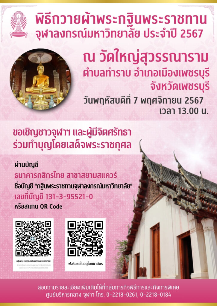 พระบาทสมเด็จพระเจ้าอยู่หัวทรงพระกรุณาโปรดเกล้าฯ พระราชทานผ้าพระกฐินพระราชทานแก่จุฬาลงกรณ์มหาวิทยาลัย เพื่อนำไปถวายพระสงฆ์ผู้จำพรรษากาลถ้วนไตรมาส ณ วัดใหญ่สุวรรณาราม ต.ท่าราบ อ.เมืองเพชรบุรี จ.เพชรบุรี ในวันพฤหัสบดีที่ 7 พฤศจิกายน 2567 เวลา 13.00 น.