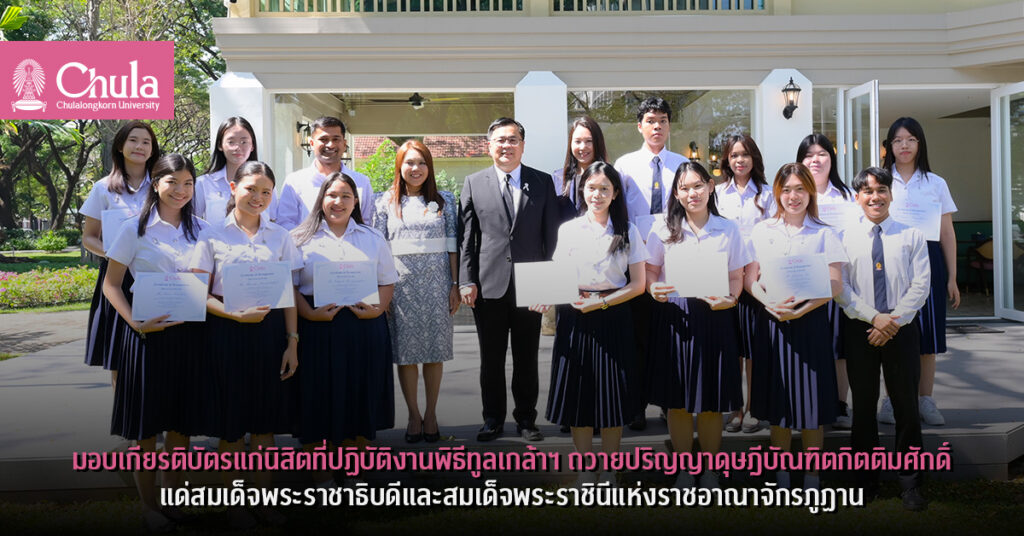อธิการบดีจุฬาฯ มอบเกียรติบัตรแก่นิสิตที่ปฏิบัติงานในพิธีทูลเกล้าฯ ถวายปริญญาดุษฎีบัณฑิตกิตติมศักดิ์ แด่สมเด็จพระราชาธิบดีและสมเด็จพระราชินีแห่งราชอาณาจักรภูฏาน