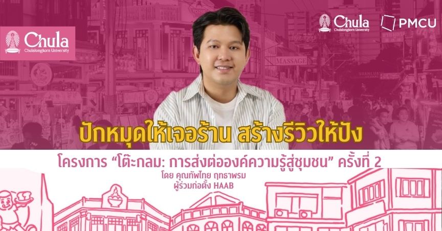 จุฬาลงกรณ์มหาวิทยาลัย โดยความร่วมมือกับสำนักงานจัดการทรัพย์สิน จุฬาฯ (PMCU) จัดกิจกรรมอบรมเชิงปฏิบัติการครั้งที่ 2 ภายใต้โครงการ “โต๊ะกลม: การส่งต่อองค์ความรู้สู่ชุมชน” ในหัวข้อ “ปักหมุดให้เจอร้าน สร้างรีวิวให้ปัง” เมื่อวันจันทร์ที่ 14 กรกฎาคม 2568 ณ อุทยาน 100 ปี จุฬาฯ โดยมีคุณทัพไทย ฤทธาพรม ผู้ร่วมก่อตั้ง HAAB ร่วมถ่ายทอดประสบการณ์การสร้างตัวตนของร้านค้าในโลกออนไลน์ เพื่อเพิ่มการมองเห็นและกระตุ้นยอดขายในยุคดิจิทัล