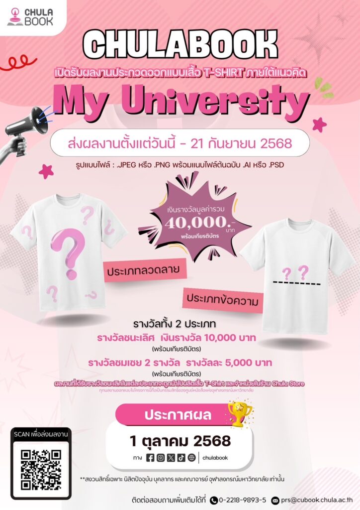ศูนย์หนังสือแห่งจุฬาฯ ขอเชิญคณาจารย์ บุคลากร และนิสิตจุฬาฯ เข้าร่วมโครงการประกวดออกแบบเสื้อ T-Shirt ภายใต้แนวคิด “My University” ชิงเงินรางวัลกว่า 40,000 บาท เพื่อเปิดโอกาสให้นิสิตปัจจุบัน บุคลากร และคณาจารย์ได้มีส่วนร่วมสร้างสรรค์ผลงานที่สะท้อนถึงความเป็นเอกลักษณ์ของมหาวิทยาลัย ผ่านการออกแบบเสื้อที่สามารถนำไปผลิตและจำหน่าย นำไปสู่การประชาสัมพันธ์ภาพลักษณ์ของมหาวิทยาลัยในวงกว้างอย่างสร้างสรรค์ โดยเน้นการถ่ายทอดอัตลักษณ์ของจุฬาฯ