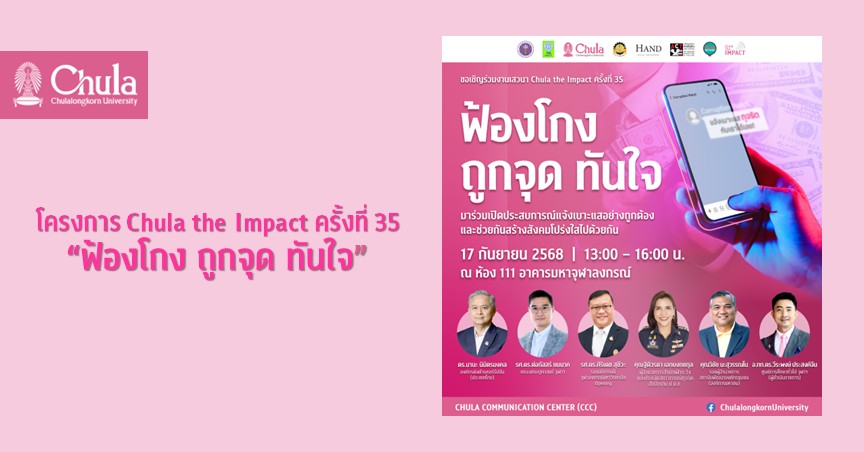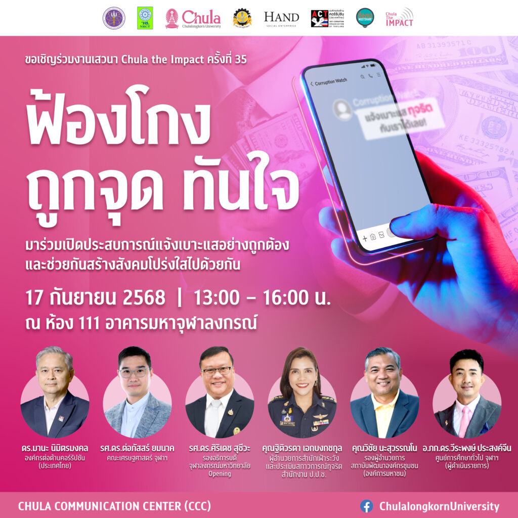 จุฬาลงกรณ์มหาวิทยาลัย โดยศูนย์สื่อสารองค์กร จุฬาฯ ขอเชิญผู้ที่สนใจและสื่อมวลชนเข้าร่วม โครงการ Chula the Impact ครั้งที่ 35 “ฟ้องโกง ถูกจุด ทันใจ” ซึ่งจะเป็นการแถลงข่าวการเปิดตัวเครื่องมือ Corruption Watch นวัตกรรมดิจิทัลเพื่อการมีส่วนร่วมของประชาชนในการต่อต้านการทุจริต ผลงานการวิจัยของคณะเศรษฐศาสตร์ จุฬาฯ ภายใต้ความร่วมมือขององค์กรต่อต้านคอร์รัปชัน (ประเทศไทย) สำนักงานคณะกรรมการป้องกันและปราบปรามการทุจริตแห่งชาติ (ป.ป.ช.) และสถาบันพัฒนาองค์กรชุมชน (องค์การมหาชน)