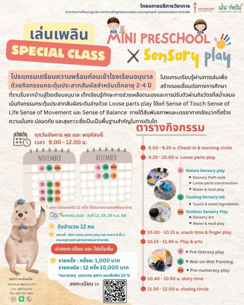 โครงการบริการวิชาการ สาขาวิชาการศึกษาปฐมวัย ภาควิชาหลักสูตรและการสอน คณะครุศาสตร์ จุฬาฯ จัดโปรแกรม “Mini Preschool x Sensory play” เตรียมความพร้อมก่อนเข้าโรงเรียนอนุบาลด้วยกิจกรรมกระตุ้นประสาทสัมผัสสำหรับเด็กอายุ 2-4 ปี