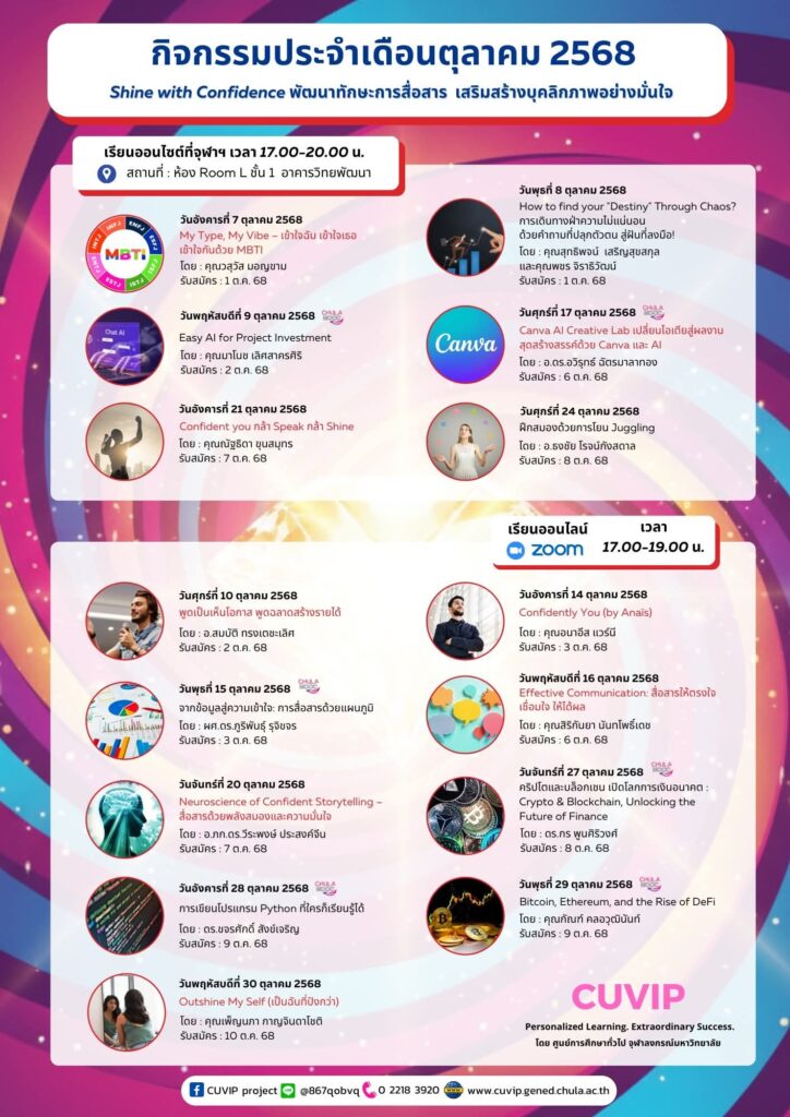 ศูนย์การศึกษาทั่วไป จุฬาฯ ชวนทุกท่านมาเพิ่มพูนความรู้ เสริมทักษะ ค้นพบความชอบ ผ่านคอร์สเรียน CUVIP เดือนตุลาคม 2568 ในธีม “Shine with Confidence: พัฒนาทักษะการสื่อสาร เสริมสร้างบุคลิกภาพอย่างมั่นใจ” โดยมีหลากหลายรายวิชาและกิจกรรมที่น่าสนใจ ดังนี้