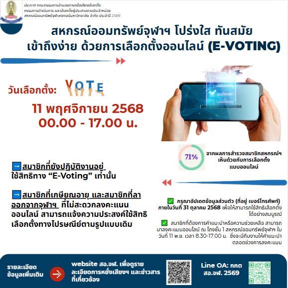 สหกรณ์ออมทรัพย์จุฬาลงกรณ์มหาวิทยาลัยขอเชิญสมาชิกสหกรณ์ออมทรัพย์ร่วมแสดงพลังเสียงของตนเองเพื่อร่วมสร้างสรรค์และพัฒนาสหกรณ์ให้โปร่งใส ก้าวทันยุคดิจิทัล และมีส่วนร่วมในการกำหนดทิศทางของสหกรณ์ออมทรัพย์จุฬาฯ ในอนาคต ด้วยการเลือกตั้งคณะกรรมการดำเนินการและผู้ประสานงานประจำหน่วย ประจำปี 2569 ในวันอังคารที่ 11 พฤศจิกายน 2568 เวลา 00.00 – 17.00 น. โดยการลงคะแนนแบบออนไลน์ (E-Voting ซึ่งในปีนี้เป็นปีแรกที่มีการเปลี่ยนรูปแบบการเลือกตั้งจากการลงคะแนนในคูหาเป็นการลงคะแนนแบบออนไลน์ (E-Voting)