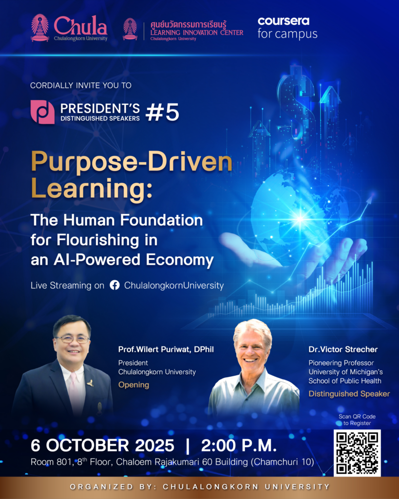 จุฬาลงกรณ์มหาวิทยาลัยจัดงาน “Chulalongkorn University President’s Distinguished Speakers ครั้งที่ 5” ในหัวข้อ “Purpose-Driven Learning: The Human Foundation for Flourishing in an AI-Powered Economy” ในวันจันทร์ที่ 6 ตุลาคม 2568 เวลา 14.00 – 16.00 น. ณ ห้อง 801 อาคารเฉลิมราชกุมารี 60 พรรษา (อาคารจามจุรี 10) จุฬาฯ โดยมี ศ.ดร.วิเลิศ ภูริวัชร ผู้รักษาการอธิการบดีจุฬาฯ เป็นผู้กล่าวเปิดงาน