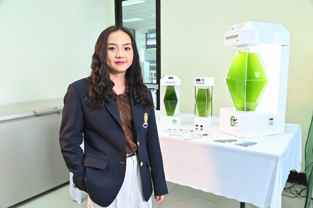 ผู้สื่อข่าวรายการ ”วันใหม่วาไรตี้” สถานีโทรทัศน์ไทยพีบีเอส สัมภาษณ์ ผศ.ดร.พิชญา อินนา อาจารย์ภาควิชาเคมีเทคนิค คณะวิทยาศาสตร์ จุฬาฯ และนายธนกฤต คมขำ นิสิตปริญญาเอก เมื่อวันพฤหัสบดีที่ 2 ตุลาคม 2568 ณ ชั้น 17 อาคารมหามกุฏ คณะวิทยาศาสตร์ จุฬาฯ เพื่อจัดทำสกู๊ปข่าวให้ความรู้เรื่องนวัตกรรมใหม่ “MICROCAP” เครื่องผลิตออกซิเจนจากจุลสาหร่าย กำจัด CO₂ เติมอากาศบริสุทธิ์ในอาคาร โดย ดร.พิชญา และนายธนกฤต อธิบายถึงกระบวนการสังเคราะห์ด้วยแสงจากจุลสาหร่าย ดูดคาร์บอนไดออกไซด์เข้าไปในเครื่องและผลิตออกซิเจนได้สูงกว่าต้นไม้ถึง 20 เท่า