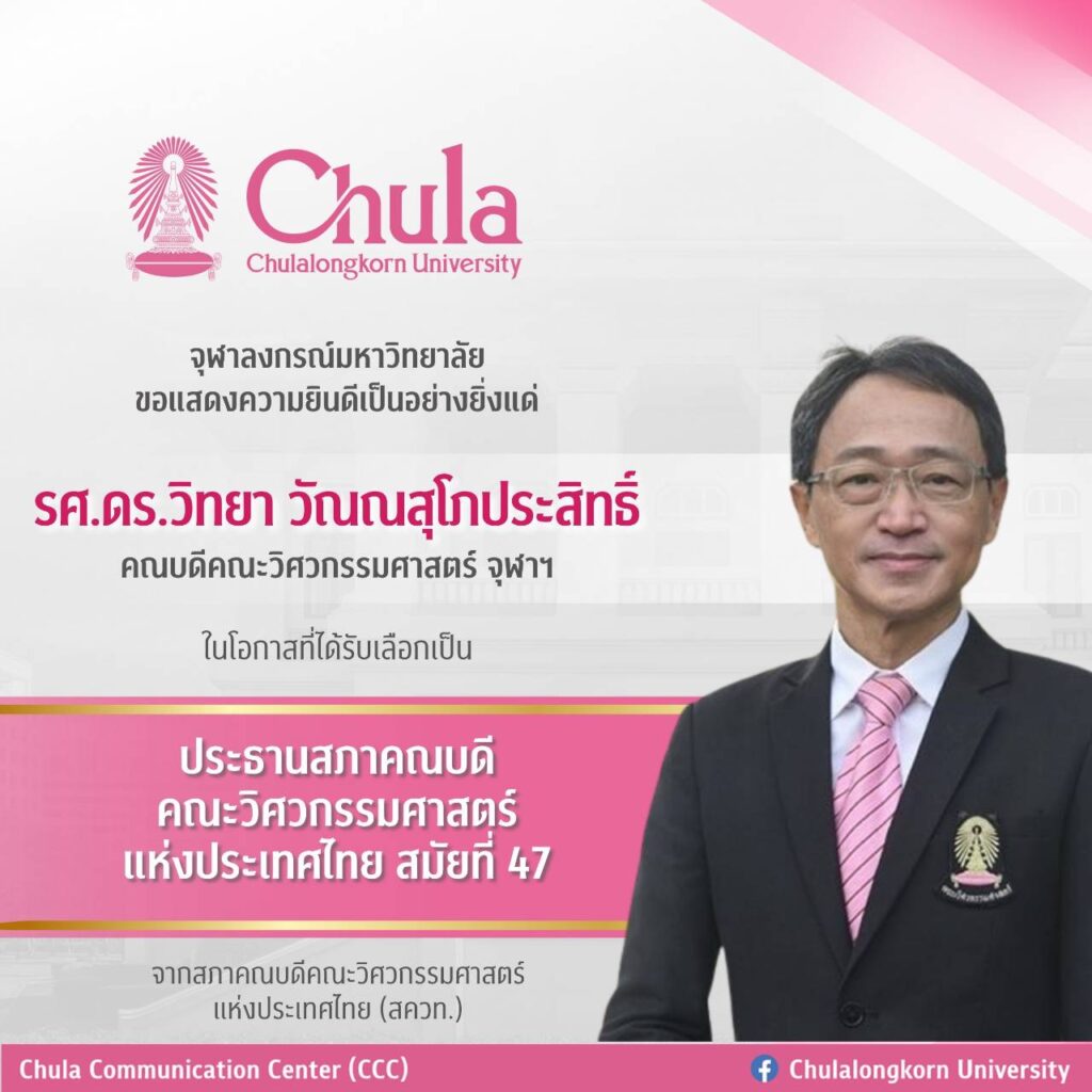 จุฬาลงกรณ์มหาวิทยาลัยขอแสดงความยินดีเป็นอย่างยิ่งแด่ รศ.ดร.วิทยา วัณณสุโภประสิทธิ์ คณบดีคณะวิศวกรรมศาสตร์ จุฬาฯ ในโอกาสที่ได้รับเลือกจากสภาคณบดีคณะวิศวกรรมศาสตร์แห่งประเทศไทย (สควท.) ให้ดำรงตำแหน่งประธานสภาคณบดีคณะวิศวกรรมศาสตร์แห่งประเทศไทย สมัยที่ 47 สืบต่อจาก รศ.ดร.ธงชัย ฟองสมุทร คณบดีคณะวิศวกรรมศาสตร์ มหาวิทยาลัยเชียงใหม่ ประธานสภาคณบดีคณะวิศวกรรมศาสตร์แห่งประเทศไทย สมัยที่ 46