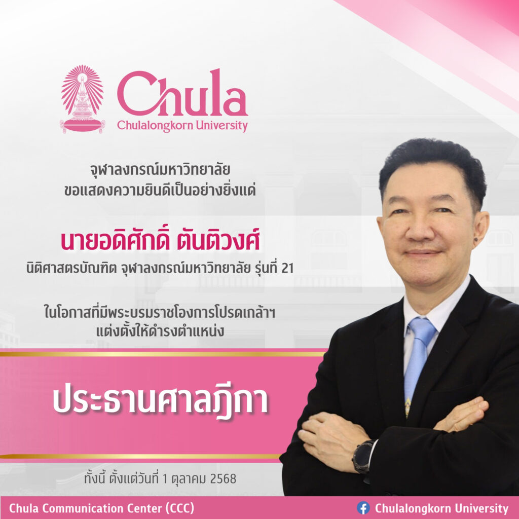 จุฬาลงกรณ์มหาวิทยาลัยขอแสดงความยินดีเป็นอย่างยิ่งแด่นายอดิศักดิ์ ตันติวงศ์ นิสิตเก่าคณะนิติศาสตร์ จุฬาฯ รุ่นที่ 21 ในโอกาสที่มีพระบรมราชโองการโปรดเกล้าฯ แต่งตั้งให้ดำรงตำแหน่งประธานศาลฎีกา