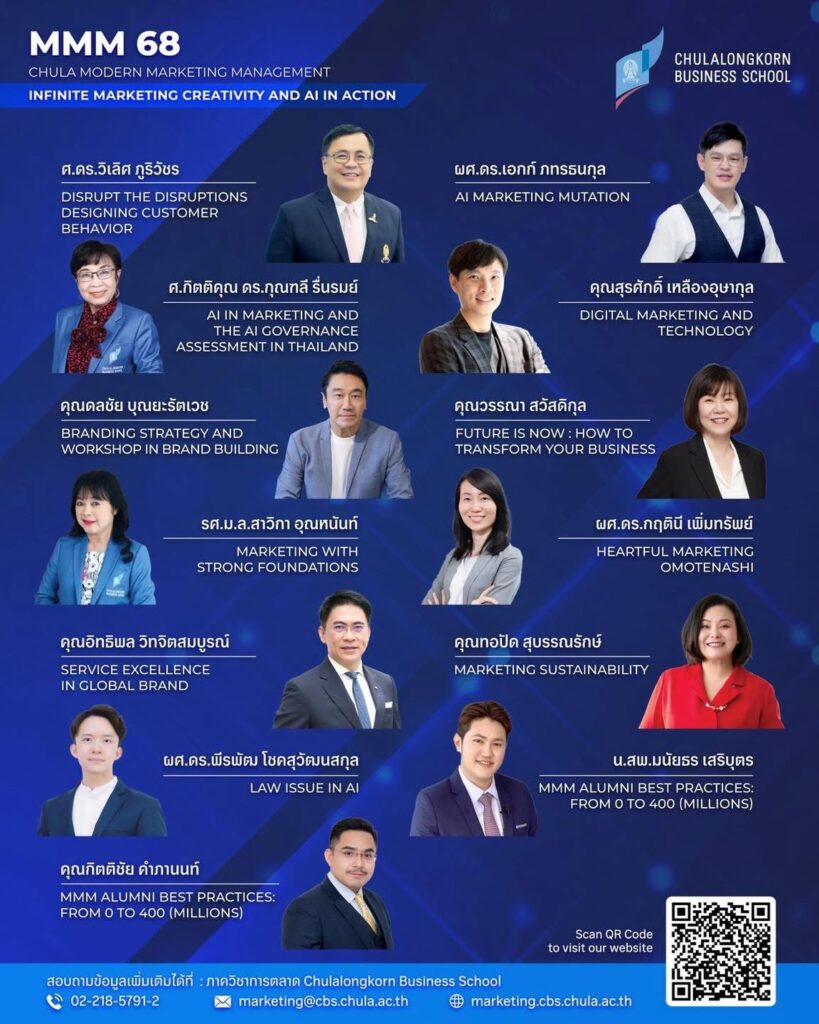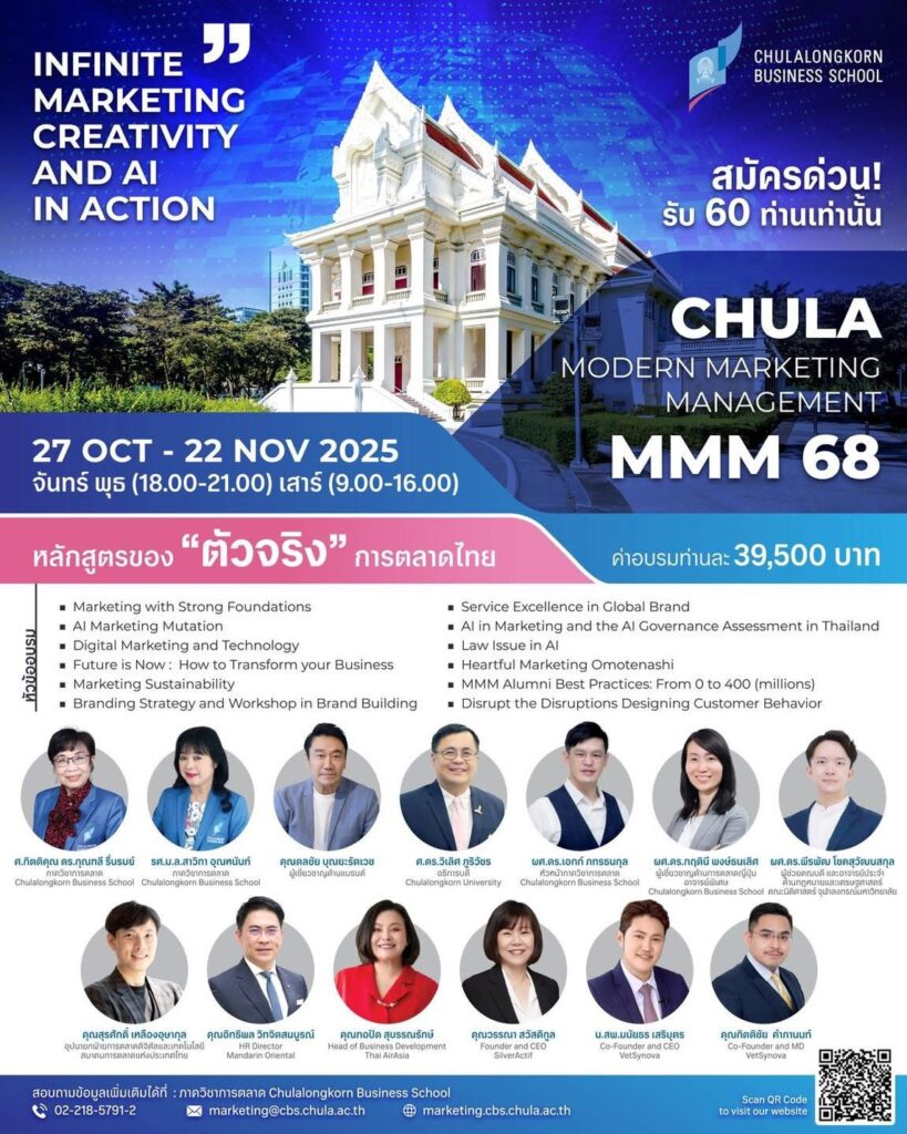 กลับมาอีกครั้งกับ CHULA Modern Marketing Management รุ่นที่ 68 หลักสูตรที่พิสูจน์แล้วว่าเป็นตัวจริงของการตลาดไทย หลักสูตรการตลาดระยะสั้นที่ดำเนินการมายาวนานที่สุดของไทย โดยภาควิชาการตลาด คณะพาณิชยศาสตร์และการบัญชี จุฬาฯ เรียนรู้การตลาดยุคใหม่ที่ผสาน Creativity + AI in Action ให้คุณได้ทั้งความรู้จริง ประสบการณ์จริง และเครือข่ายจริงจากกูรูตัวจริงในวงการอบรมระหว่างวันที่ 27 ตุลาคม – 22 พฤศจิกายน 2025 ทุกวันจันทร์ พุธ (18.00–21.00 น.) และวันเสาร์ (09.00–16.00 น.)พบกับหัวข้อการอบรมที่เข้มข้นโดยคณาจารย์และวิทยากรจากจุฬาฯ และผู้เชี่ยวชาญระดับแถวหน้าของไทยและต่างประเทศ ที่จะยกระดับความคิดและการทำงานของคุณให้ก้าวทันโลกการตลาดยุคใหม่ อาทิ• AI Marketing Mutation• Digital Marketing and Technology• Marketing Sustainability• Branding Strategy & Workshop• Service Excellence in Global Brand• Heartful Marketing Omotenashi• Disrupt the Disruptions: Designing Customer Behavior• Best Practices: ประสบการณ์จริงจากศิษย์เก่า MMM ที่เริ่มคว้าความสำเร็จจากการมาเรียนในโครงการค่าลงทะเบียน 39,500 บาท รับจำนวนจำกัดเพียง 60 ที่นั่ง หากเข้าเรียนครบ 80% รับวุฒิบัตรจากจุฬาลงกรณ์มหาวิทยาลัยสมัครเข้าร่วมโครงการอบรมได้ที่https://marketing.cbs.chula.ac.th/th/prospectus/modern-marketing-management/overview