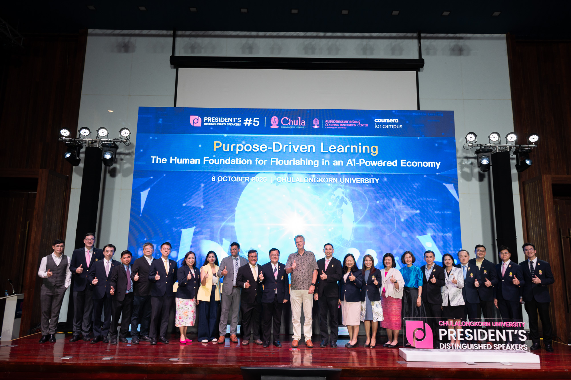 จุฬาลงกรณ์มหาวิทยาลัยโดยศูนย์นวัตกรรมการเรียนรู้ จุฬาฯ ร่วมกับ Coursera for Campus จัดงาน President’s Distinguished Speakers ครั้งที่ 5 เมื่อวันที่ 6 ตุลาคม 2568 ณ ห้อง 801 อาคารเฉลิมราชกุมารี 60 พรรษา (อาคารจามจุรี 10) โดยมี ศ.ดร.วิเลิศ ภูริวัชร อธิการบดีจุฬาฯ เป็นผู้กล่าวเปิดงาน จากนั้นเป็นการบรรยายพิเศษเรื่อง “Purpose-Driven Learning: The Human Foundation for Flourishing in an AI-Powered Economy” (การเรียนรู้ที่ขับเคลื่อนด้วยเป้าหมายและทักษะเพื่อผลลัพธ์ที่ยั่งยืนในเศรษฐกิจยุคใหม่ที่ขับเคลื่อนด้วย AI) โดย Dr.Victor Strecher, Pioneering Professor, School of Public Health, University of Michigan นักวิทยาศาสตร์พฤติกรรมผู้มีชื่อเสียง นักเขียน และผู้สอนบนแพลตฟอร์ม Coursera ผู้สร้างหลักสูตรออนไลน์ชื่อดัง “Finding Purpose and Meaning in Life” ซึ่งได้รับการจัดอันดับโดยนิตยสาร Inc. ให้เป็นคอร์สออนไลน์ที่ดีที่สุดอันดับ 4 ของโลกในปี 2020 ดำเนินรายการโดย อ. ดร.ถิรพุทธิ์ ปิติฉัตร ผู้ช่วยอธิการบดี ด้านพัฒนาองค์กร