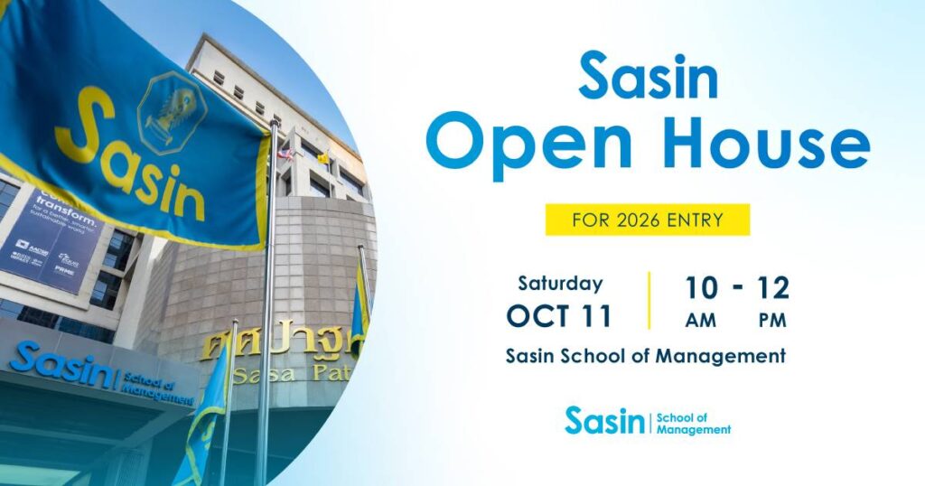 Sasin School of Management ขอเชิญผู้ที่สนใจสมัครเรียนในปีการศึกษา 2569 ร่วมงาน Sasin Open house ในวันเสาร์ที่ 11 ตุลาคม 2568 เวลา 10.00-12.00 น. จัดที่ศศินทร์ ผู้เข้าร่วมงานจะได้รับรู้ข้อมูลเพิ่มเติมเกี่ยวกับหลักสูตรของ Sasin (Flexible MBA, Executive MBA, Connect + Executive MBA, DBA) ภายในงานมีนิสิตปัจจุบัน นิสิตเก่า และคณาจารย์ศศินทร์ มาร่วมแบ่งปันเล่าประสบการณ์ พร้อมสอบถามข้อมูลเกี่ยวกับการเรียนการสอนตามโปรแกรมที่สนใจ