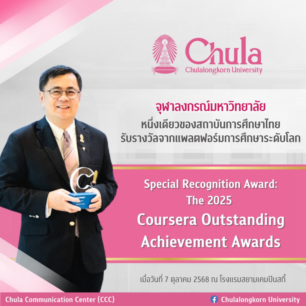 จุฬาลงกรณ์มหาวิทยาลัย หนึ่งเดียวของสถาบันการศึกษาไทยที่คว้ารางวัลจากแพลตฟอร์มการศึกษาระดับโลก Special Recognition Award: The 2025 “Coursera Outstanding Achievement Awards จากผลงานที่โดดเด่นในด้านการสร้างนวัตกรรมทางการศึกษาเพื่อสังคม