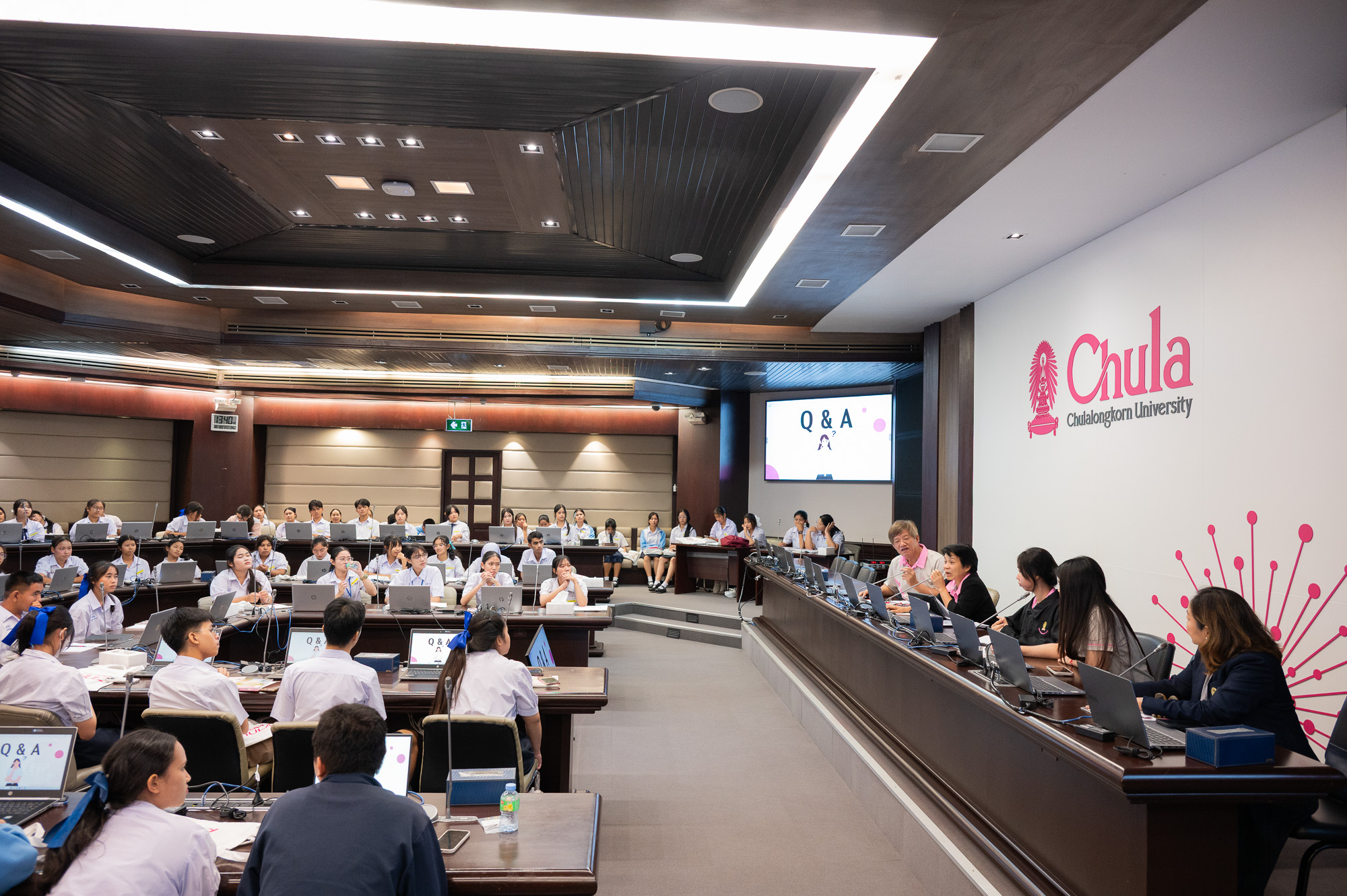 คุณวิชญ์พิพล ติวะตันสกุล ที่ปรึกษาด้านนโยบายและแผนงาน สำนักงานสภาพัฒนาการเศรษฐกิจและสังคมแห่งชาติ สำนักนายกรัฐมนตรี นำคณะนักเรียนทุนพระราชทานฯ มาที่อาคารจามจุรี 4 การบรรยายเริ่มต้นด้วยการกล่าวต้อนรับอย่างเป็นกันเองโดยคุณธาริณี ไชยประพาฬ ผู้อำนวยการศูนย์สื่อสารองค์กร จุฬาฯ คุณวศพัชร โยธาจันทร์ ผู้อำนวยการฝ่ายขับเคลื่อนพันธกิจ สำนักบริหารวิชาการ จุฬาฯ และคณะ ให้ข้อมูลเกี่ยวกับการเรียนและการสอบเข้าศึกษาในจุฬาลงกรณ์มหาวิทยาลัย และตอบคำถามของนักเรียน การรับชมวีดิทัศน์แนะนำจุฬาฯ รวมทั้งรุ่นพี่นิสิตจุฬาฯ บอกเล่าประสบการณ์การสอบเข้าศึกษา