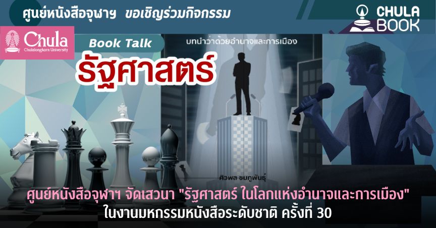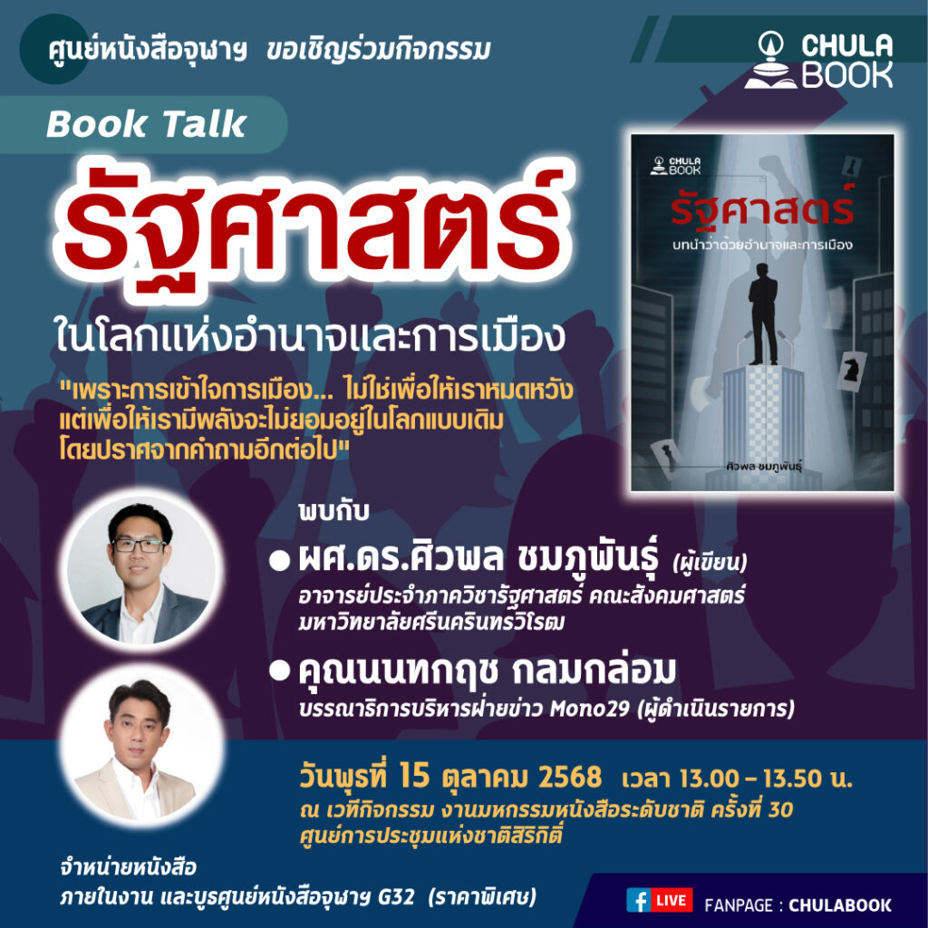 ศูนย์หนังสือจุฬาลงกรณ์มหาวิทยาลัย ขอเชิญร่วมงาน BOOK TALK “รัฐศาสตร์ ในโลกแห่งอำนาจและการเมือง” ในวันพุธที่ 15 ตุลาคม 2568 เวลา 13.00 – 13.50 น. ณ เวทีกิจกรรม งานมหกรรมหนังสือระดับชาติ ครั้งที่ 30 ศูนย์การประชุมแห่งชาติสิริกิติ์