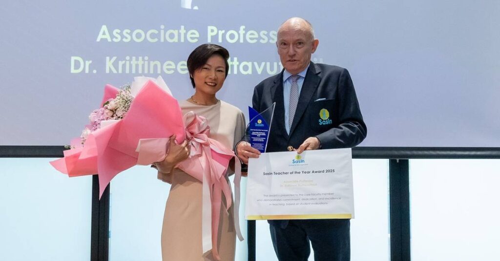 ศ.ดร.เอียน เฟนวิค ผู้อำนวยการสถาบันบัณฑิตบริหารธุรกิจ ศศินทร์ แห่งจุฬาลงกรณ์มหาวิทยาลัย มอบรางวัลอาจารย์ผู้สอนดีเลิศ ประจำปี 2568 ให้กับ รศ.ดร.กฤตินี ณัฏฐวุฒิสิทธิ์ อาจารย์ประจำสาขาการตลาด เพื่อยกย่องอาจารย์ผู้มีแนวทางการสอนที่โดดเด่น มีความวิริยะอุตสาหะ อุทิศตนทุ่มเทเพื่อการเรียนการสอน และนิสิตสามารถนำวิชาความรู้ไปปฏิบัติได้จริงในการทำงาน พิธีมอบรางวัลจัดขึ้นในงานครบรอบการก่อตั้ง 43 ปี ของศศินทร์ เมื่อเร็วๆ นี้