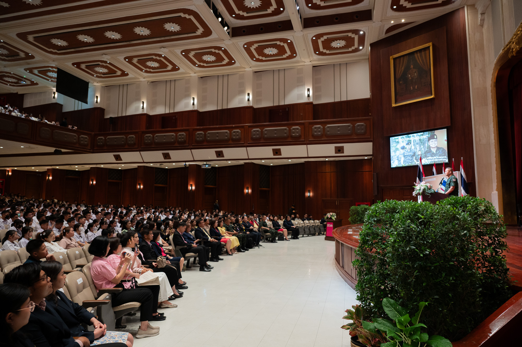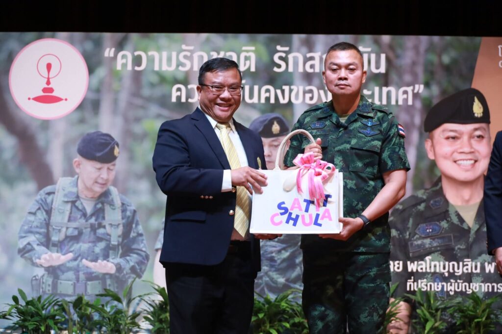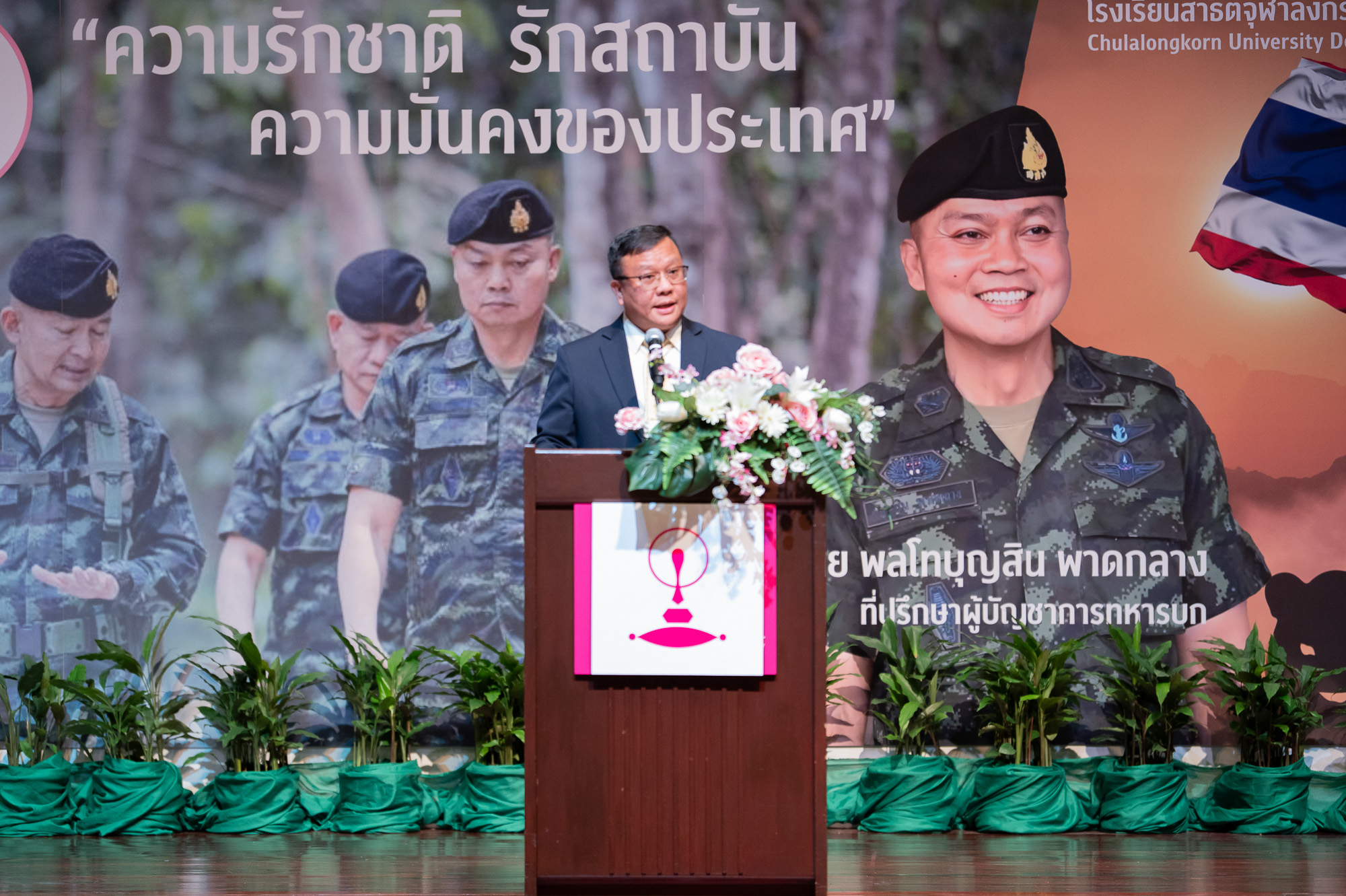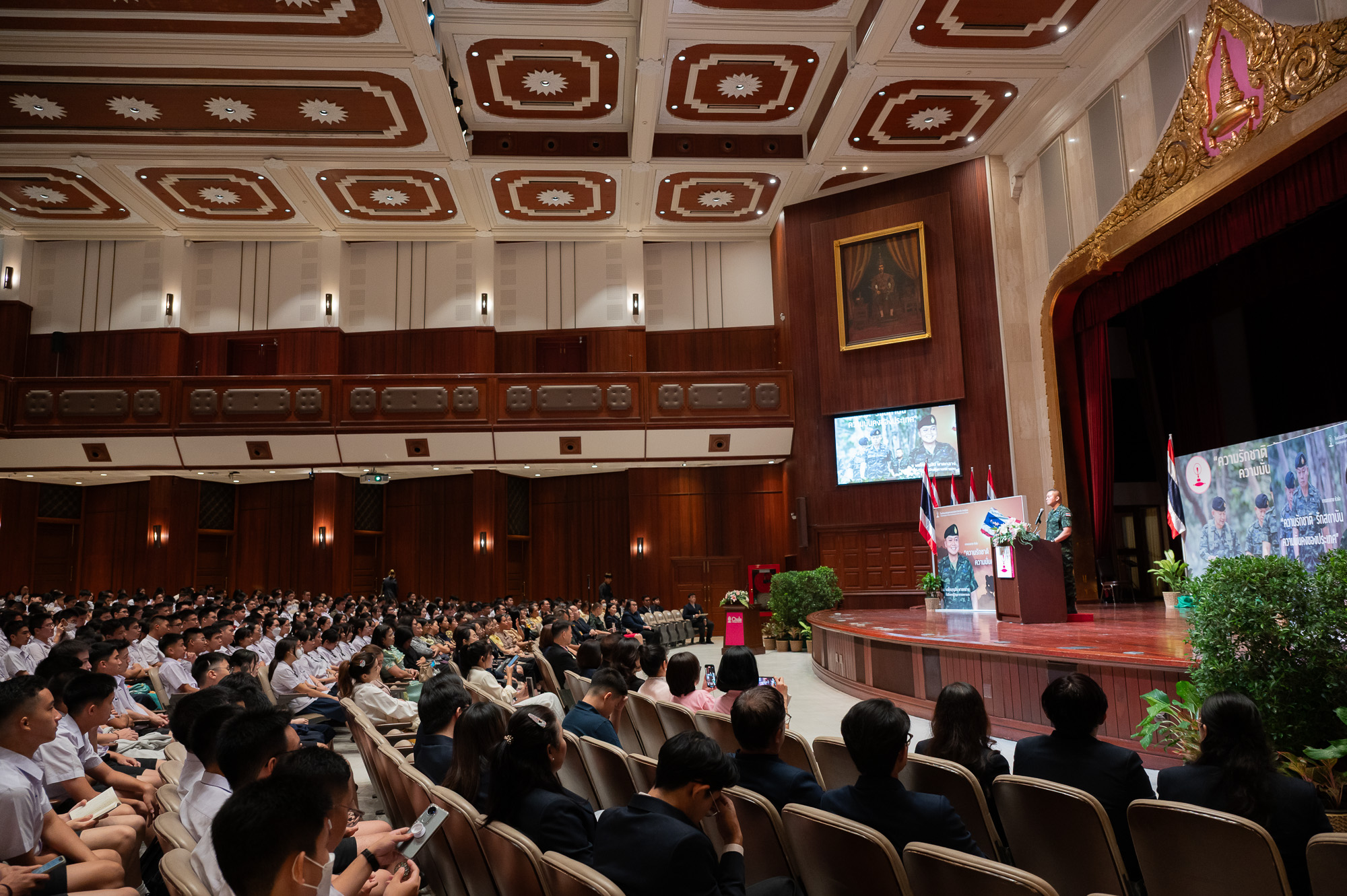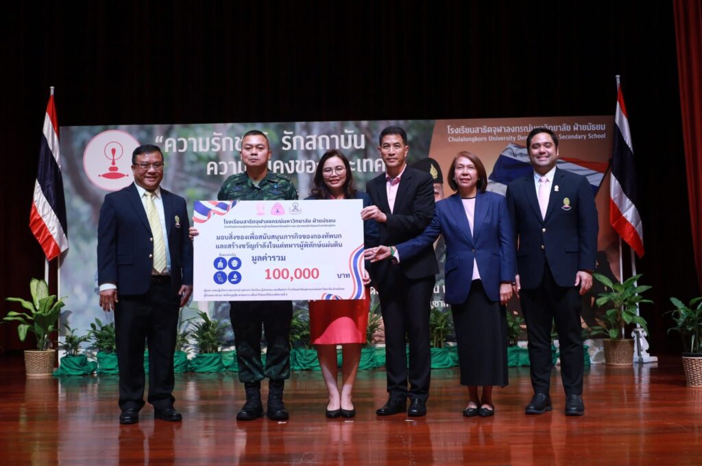 ก่อนการบรรยายได้มีพิธีรับมอบเงินบริจาคและสิ่งของเพื่อสนับสนุนภารกิจของทหารผู้พิทักษ์แผ่นดินจากโรงเรียนสาธิตจุฬาลงกรณ์มหาวิทยาลัย ฝ่ายมัธยม และตัวแทนนักเรียนกลุ่ม “พระเกี้ยวกล้าอาสา”