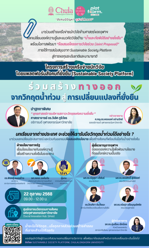 ขอเชิญคณาจารย์ นักวิจัย และผู้สนใจเข้าร่วมงานเสวนาเพื่อร่วมสร้างทางออกจากวิกฤตน้ำท่วม สู่การเปลี่ยนแปลงที่ยั่งยืน จัดโดยโครงการสร้างเครือข่ายนักวิจัย โดยแพลตฟอร์มสังคมที่ยั่งยืน (Sustainable Society Platform) สำนักบริหารวิจัย จุฬาฯ ในวันที่ 22 ตุลาคม 2568 เวลา 09.00 – 12.00 น ณ ศูนย์กลางนวัตกรรมทางสังคมแห่งจุฬาฯ (Social Innovation Hub: SiHub) โดยมี ศ.ดร.วิเลิศ ภูริวัชร อธิการบดีจุฬาฯ ร่วมปาฐกถาพิเศษในหัวข้อ “ยุทรศาสตร์การบริหารสภาวะวิกฤตแห่งความยั่งยืน”