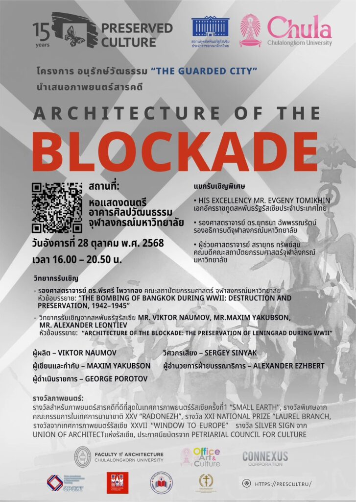 ขอเชิญร่วมงาน “The Guarded City” นิทรรศการ การบรรยาย การฉายภาพยนตร์ ว่าด้วย “สถาปัตยกรรม ท่ามกลางสงคราม และความทรงจำทางวัฒนธรรม” จัดโดยคณะสถาปัตยกรรมศาสตร์ จุฬาลงกรณ์มหาวิทยาลัย สถานเอกอัครราชทูตรัสเซียประจำประเทศไทย สำนักงานบริหารศิลปวัฒนธรรม จุฬาลงกรณ์มหาวิทยาลัย และมูลนิธิอนุรักษ์วัฒนธรรม (Preserved Culture Foundation) ในวันอังคารที่ 28 ตุลาคม 2568 เวลา 16.00 – 20.50 น. ณ หอแสดงดนตรี อาคารศิลปวัฒนธรรม จุฬาลงกรณ์มหาวิทยาลัยไฮไลท์ภายในงาน