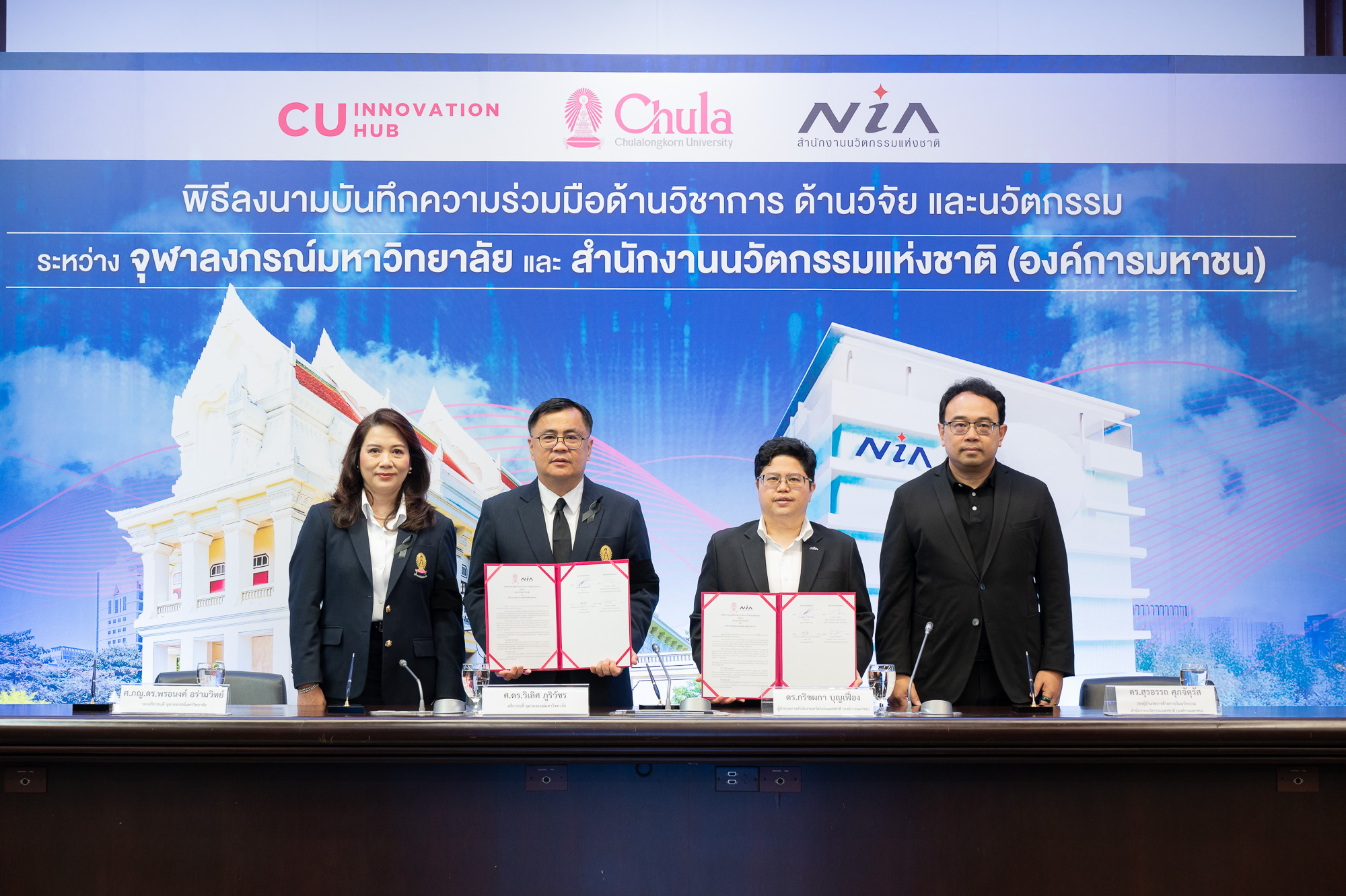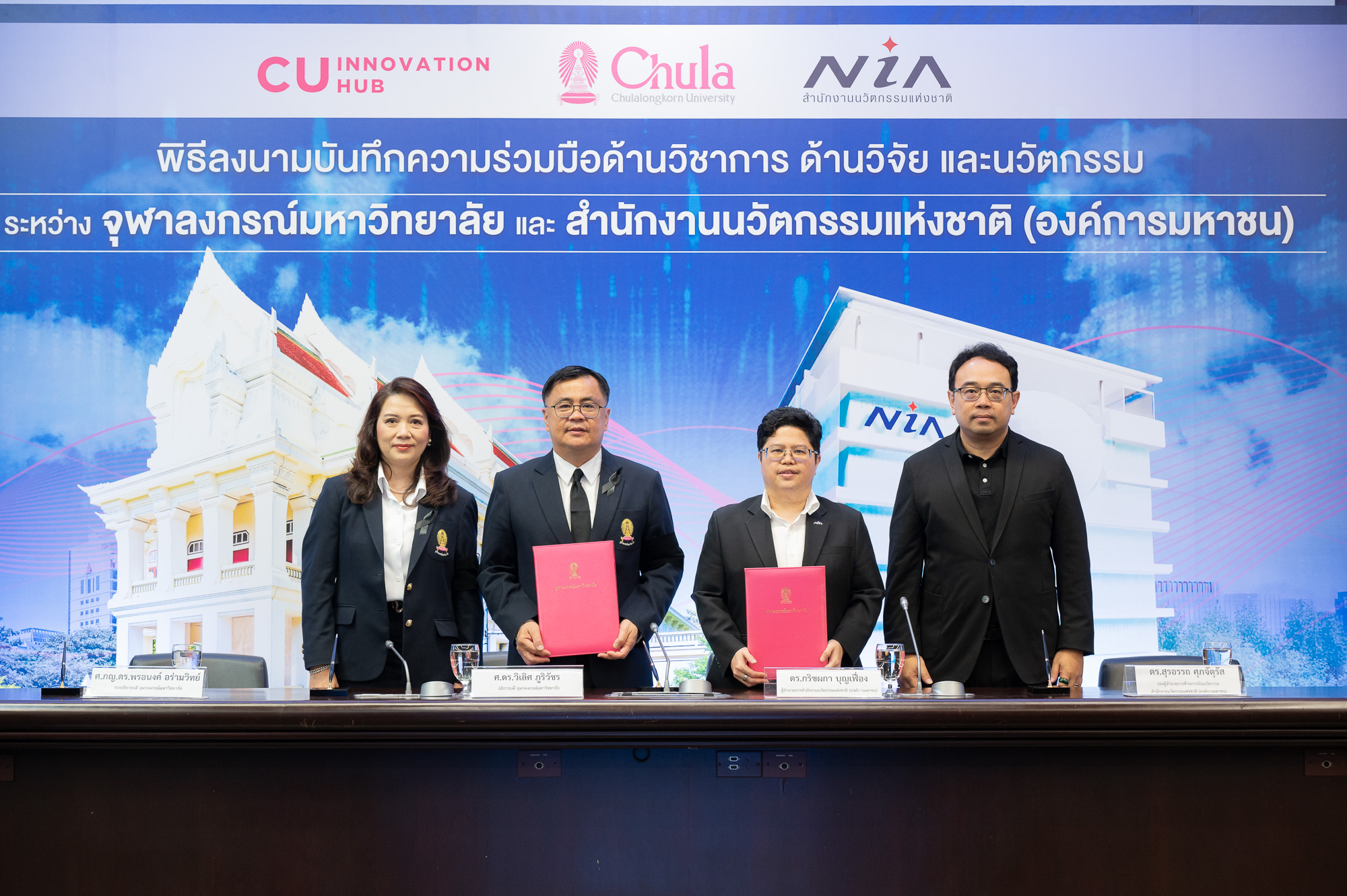 ศ.ดร.วิเลิศ ภูริวัชร อธิการบดีจุฬาลงกรณ์มหาวิทยาลัย กล่าวว่า “จุฬาฯ มุ่งพัฒนานิสิตให้เป็นผู้นำการเปลี่ยนแปลงผ่านนวัตกรรม โดยเปิดโอกาสให้นิสิตได้เรียนรู้จากการลงมือทำจริงและทำงานร่วมกับภาคีเครือข่ายจากหลายภาคส่วน ความร่วมมือกับ NIA ในครั้งนี้จะช่วยต่อยอดผลงานวิจัยของมหาวิทยาลัยให้สามารถนำไปใช้ประโยชน์ได้จริงในระดับประเทศและระดับสากล พร้อมสร้างแรงบันดาลใจให้นิสิตเป็นผู้ประกอบการรุ่นใหม่ที่มีศักยภาพและมีจิตสำนึกเพื่อสังคม”
