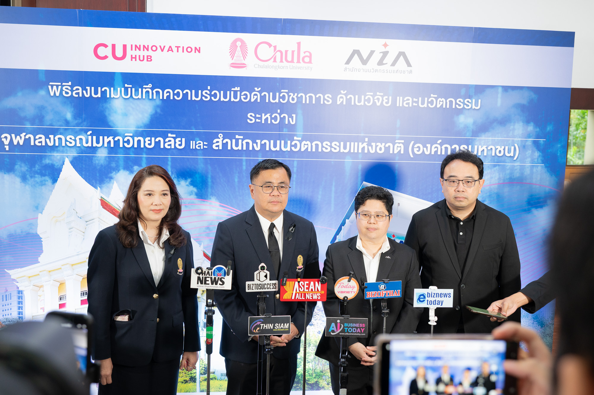 พิธีลงนามบันทึกความเข้าใจระหว่างจุฬาลงกรณ์มหาวิทยาลัยและสำนักงานนวัตกรรมแห่งชาติ (องค์การมหาชน) เพื่อขับเคลื่อน “โครงการผู้ประกอบการรุ่นใหม่ในรั้วมหาวิทยาลัย” จัดขึ้นเมื่อวันจันทร์ที่ 27 ตุลาคม 2568 ณ ห้อง 202 อาคารจามจุรี 4 จุฬาลงกรณ์มหาวิทยาลัย โดยมี ศ.ดร.วิเลิศ ภูริวัชร อธิการบดีจุฬาลงกรณ์มหาวิทยาลัย และ ดร.กริชผกา บุญเฟื่อง ผู้อำนวยการสำนักงานนวัตกรรมแห่งชาติ (มหาชน) กล่าวถึงบทบาทและเป้าหมายของความร่วมมือด้านวิชาการ ด้านวิจัยและนวัตกรรม และเป็นประธานในพิธีลงนามร่วมมือในครั้งนี้