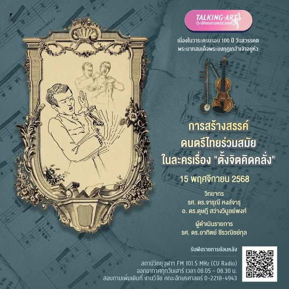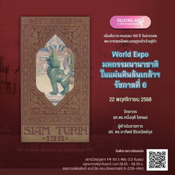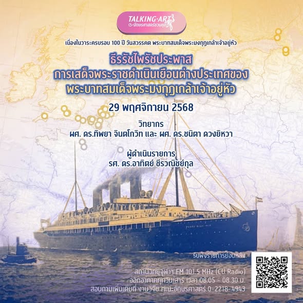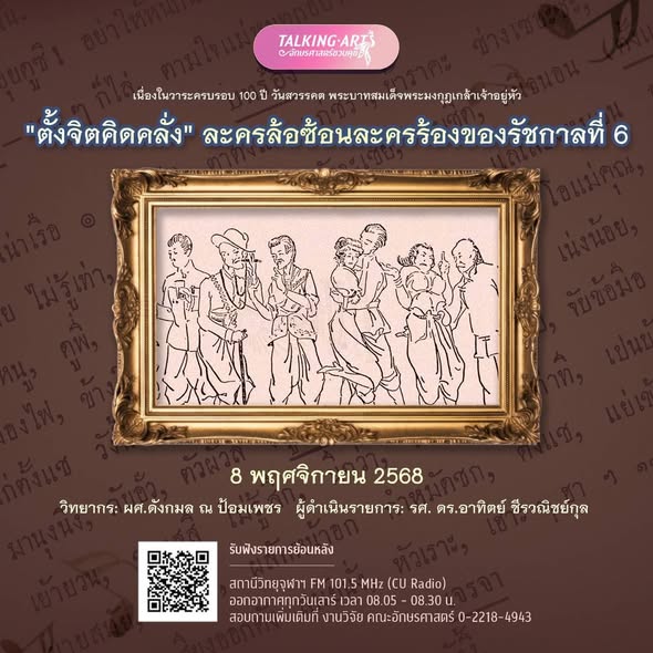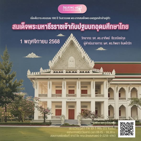 เพื่อร่วมเฉลิมพระเกียรติและน้อมรำลึกในพระมหากรุณาธิคุณ เนื่องในวาระครบรอบ 100 ปี วันสวรรคต พระบาทสมเด็จพระมงกุฎเกล้าเจ้าอยู่หัว 25 พฤศจิกายน 2568 คณะอักษรศาสตร์ จุฬาฯ ขอเชิญประชาชน นิสิต และผู้สนใจ ร่วมติดตามรายการ Talking Arts: อักษรศาสตร์ชวนคุย ชุดพิเศษ “ธีรราชอักษรศาสตร์พิจารณ์” ถ่ายทอดพระเกียรติคุณและพระราชกรณียกิจของสมเด็จพระมหาธีรราชเจ้าอย่างรอบด้าน ทั้งประวัติศาสตร์ การอุดมศึกษา ศิลปะการละคร ดนตรี ตลอดจนบทบาทการนำไทยสู่เวทีนานาชาติ ออกอากาศทุกวันเสาร์ เวลา 08.05–08.30 น. ตลอดเดือนพฤศจิกายน 2568 ทางสถานีวิทยุจุฬาฯ FM 101.5 MHz