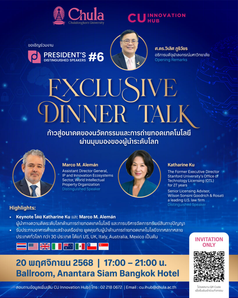 จุฬาลงกรร์มหาวิทยาลัยขอเชิญชวนผู้สนใจด้านนวัตกรรมและบุคลากรในระบบนิเวศธุรกิจนวัตกรรม ร่วมรับชมถ่ายทอดสด (Live Streaming) งานเสวนา President’s Distinguished Talk ครั้งที่ 6 ซึ่งจัดขึ้นในวันพฤหัสบดีที่ 20 พฤศจิกายน 2568 เวลา 17.00 – 21.00 น. ณ ห้อง Ballroom โรงแรมอนันตรา สยาม กรุงเทพฯ