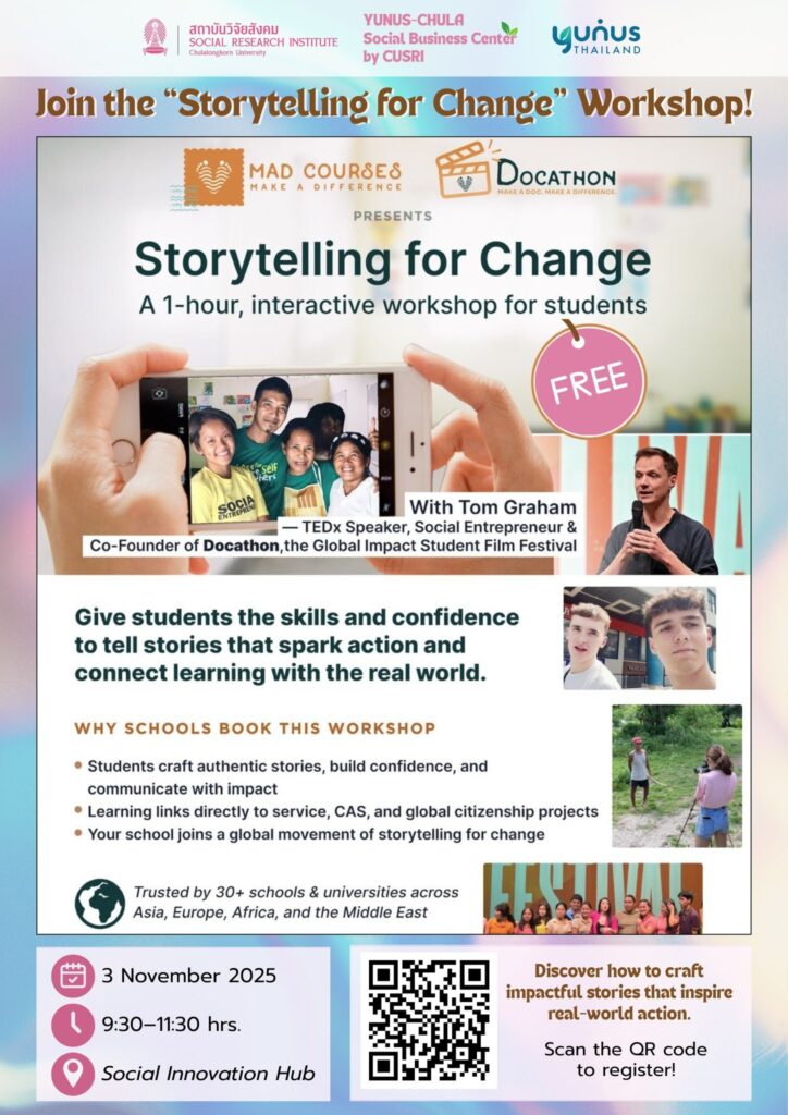 สถาบันวิจัยสังคม จุฬาฯ ขอเชิญนิสิตและผู้ที่สนใจเข้าร่วม Workshop “Storytelling for Change” ที่จะเปิดมุมมองใหม่ในการ “เล่าเรื่องเพื่อสร้างการเปลี่ยนแปลง” โดยมีคุณ Tom Graham — TEDx Speaker และผู้ร่วมก่อตั้ง Docathon ผู้เชี่ยวชาญด้านสังคมและสื่อสร้างแรงบันดาลใจเป็นวิทยากร ในวันจันทร์ที่ 3 พฤศจิกายน 2568 เวลา 09.30 – 11.30 น. ณ Social Innovation Hub อาคารวิศิษฐ์ ประจวบเหมาะ
