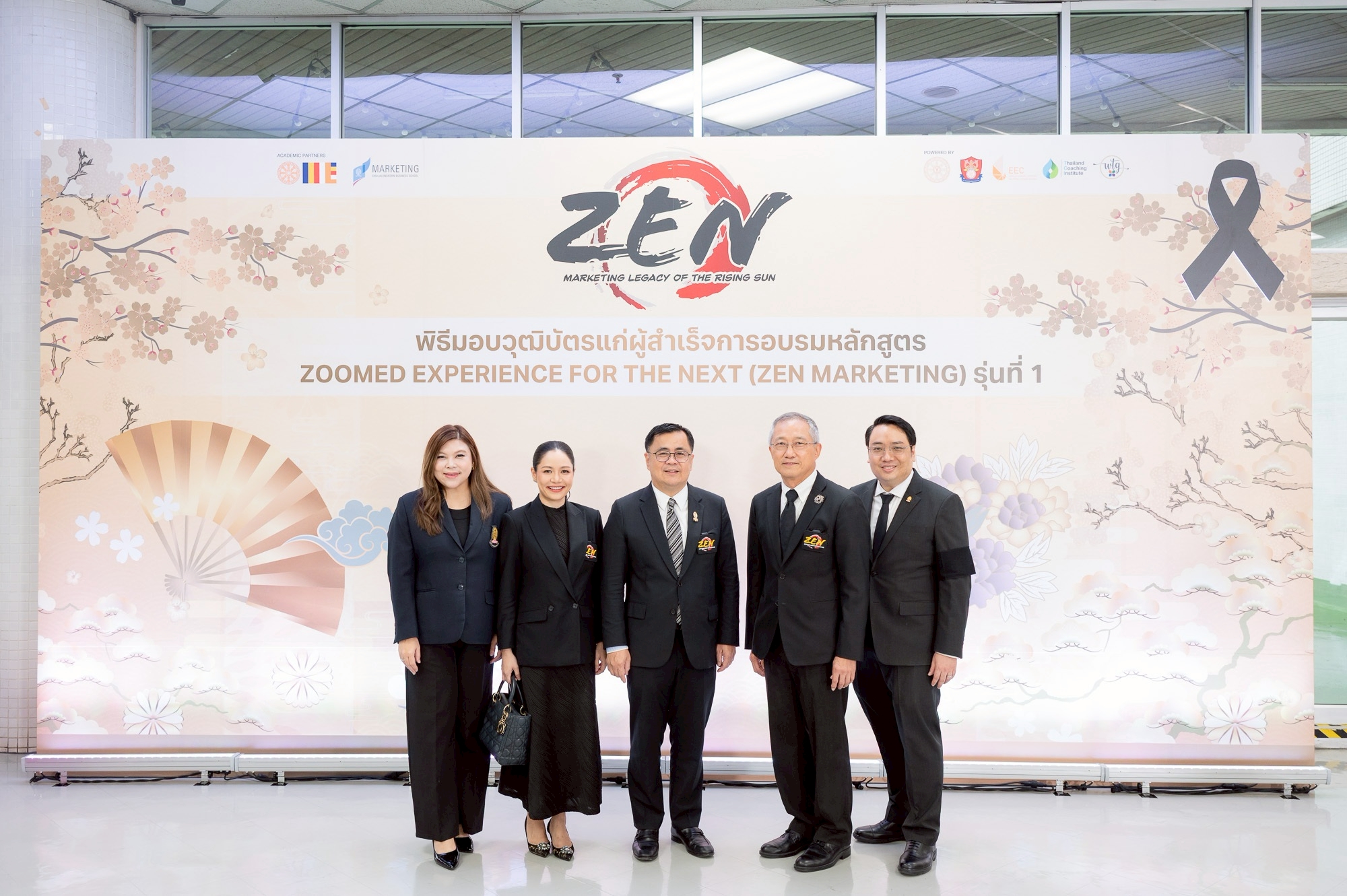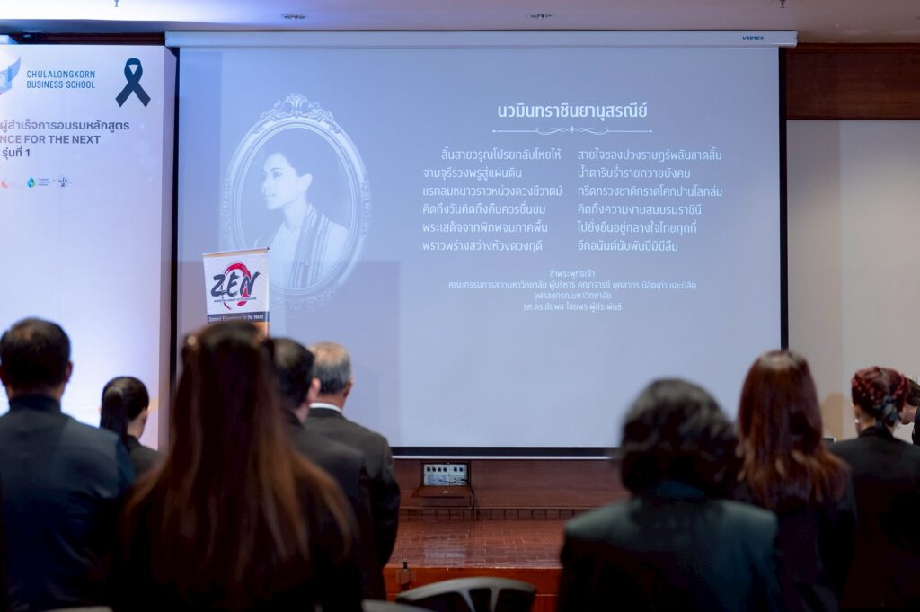 ก่อนเริ่มงานผู้ผ่านการอบรมร่วมพิธีถวายความอาลัยแด่สมเด็จพระนางเจ้าสิริกิติ์ พระบรมราชินีนาถ พระบรมราชชนนีพันปีหลวง หลังจาก ศ.ดร.วิเลิศ ภูริวัชร อธิการบดีบรรยายจบลงแล้ว ผศ.ดร.ปณิธาน จันทองจีน ประธานหลักสูตร Zen Marketing กล่าวรายงานผลการดำเนินงาน มีผู้สำเร็จหลักสูตรการอบรมจำนวน 33 ท่าน