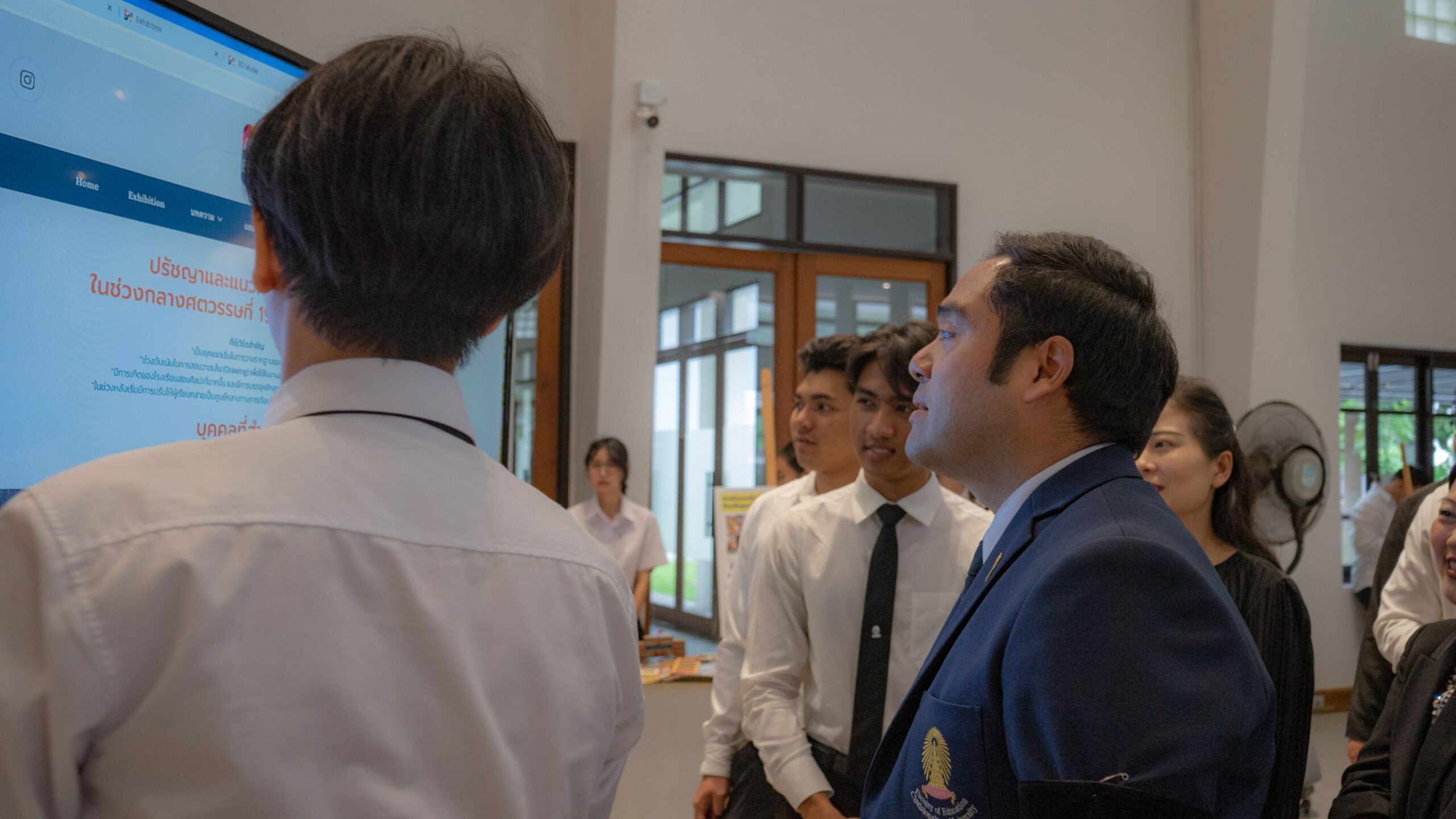 กรณัญญ์ เต็มบุญเกิด นิสิตชั้นปีที่ 3 สาขาวิชาเทคโนโลยีการศึกษา ในฐานะหัวหน้าโครงการฝ่ายเทคโนโลยีการนำเสนอ กล่าวว่า การออกแบบเว็บไซต์นิทรรศการเสมือนจริงมีจุดมุ่งหมายเพื่อขยายพื้นที่การเข้าถึงองค์ความรู้ให้กว้างขึ้นและตอบสนองรูปแบบการเรียนรู้ในยุคดิจิทัล จึงได้มีการออกแบบเว็บไซต์ Visual Aura: Where Art Meets Education Immersion ให้เป็นพื้นที่ที่ผู้ชมสามารถเข้าถึงไทม์ไลน์เนื้อหาศิลปศึกษา สำรวจโมเดล 3 มิติของสื่อที่จัดแสดงในห้องนิทรรศการจริง และเดินชมพื้นที่นิทรรศการได้แบบเสมือนจริงด้วยภาพมุมกว้าง 360 องศา ซึ่งเปิดโอกาสให้ทุกคนสามารถเรียนรู้ได้ ทุกที่ ทุกเวลา ไม่จำเป็นต้องเดินทางมายังสถานที่จริงเพียงอย่างเดียว การจัดทำเว็บไซต์ดังกล่าวเป็นการทำงานร่วมกันอย่างใกล้ชิดระหว่างนิสิตทั้งสองสาขาวิชา โดยฝ่ายศิลปศึกษาเป็นผู้สังเคราะห์เนื้อหาทางทฤษฎี ส่วนฝ่ายเทคโนโลยีการศึกษาแปลงเนื้อหานั้นให้เกิดรูปแบบการนำเสนอที่มีความเหมาะสม เข้าถึงง่าย และกระตุ้นให้ผู้ชมเกิดการปฏิสัมพันธ์ ซึ่งเทคโนโลยีไม่ได้มาแทนที่ศิลปะ แต่ทำหน้าที่เป็นสะพานเชื่อมให้คนได้เข้าถึงศิลปะในแบบที่สอดคล้องกับวิถีชีวิตปัจจุบัน