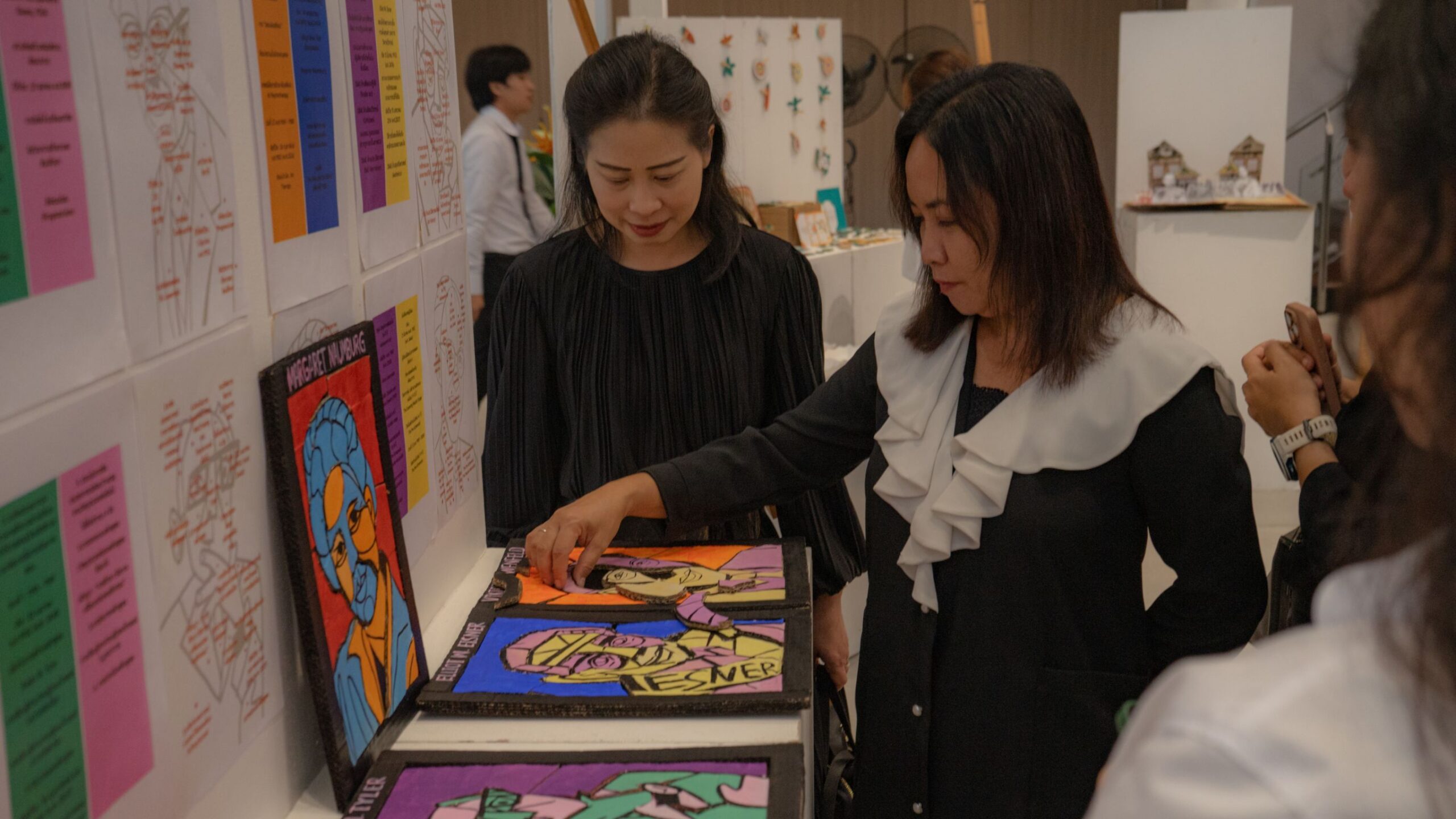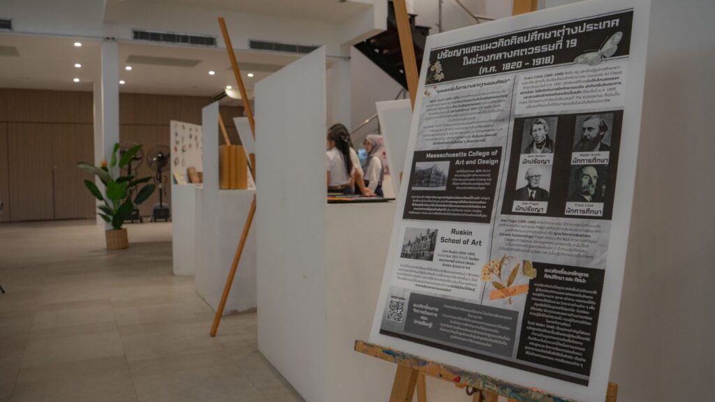 ทศพร อ้วนจี นิสิตชั้นปีที่ 3 สาขาวิชาศิลปศึกษา หัวหน้าโครงการฝ่ายเนื้อหา กล่าวว่านิทรรศการนี้ถือเป็นครั้งแรกของการนำเสนอประวัติศาสตร์และปรัชญาศิลปศึกษาของทั้งไทยและต่างประเทศในลักษณะนิทรรศการเชิงสาธารณะภายในคณะครุศาสตร์ โดยในกระบวนการจัดทำมีการย้อนไปศึกษาทฤษฎีและแนวคิดดั้งเดิมของศิลปศึกษาในช่วงเวลาต่าง ๆ ตั้งแต่ช่วงริเริ่มของการศึกษาแบบหัตถกรรม มาสู่แนวคิดศิลปะเชิงการรับรู้ การสร้างอัตลักษณ์ และแนวทางศิลปศึกษาเพื่อการเปลี่ยนแปลงทางสังคม โดยการสังเคราะห์องค์ความรู้เหล่านี้ให้กระชับและเข้าใจง่ายถือเป็นงานที่ท้าทายมาก ผู้จัดทำจึงได้เลือกใช้สื่อที่สร้างประสบการณ์ เช่น หนังสือป๊อปอัพ บอร์ดเกม และโมเดลกระดาษ เพื่อให้ผู้ชมได้ตีความและสร้างความหมายร่วมด้วยตนเอง