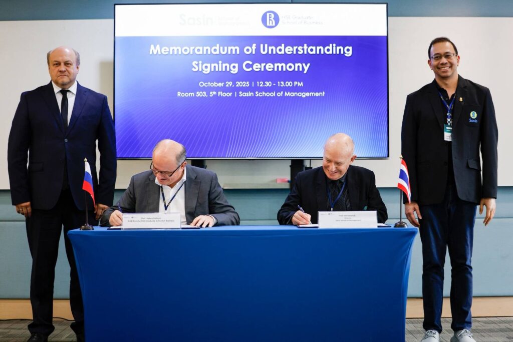 วันที่ 29 ตุลาคม ที่ผ่านมา ศาสตราจารย์ เอียน เฟนวิค (Professor Ian Fenwick) ผู้อำนวยการสถาบันบัณฑิตบริหารธุรกิจ ศศินทร์ แห่งจุฬาลงกรณ์มหาวิทยาลัย (Sasin School of Management) และศาสตราจารย์ คัตคาโล วาเลรี (Professor Katkalo Valery) ผู้อำนวยการ HSE Graduate School of Business (HSE GSB) ประเทศรัสเซีย ร่วมลงนามในบันทึกข้อตกลงความร่วมมือทางด้านการวิจัยและโครงการทางการศึกษา ระหว่างจุฬาลงกรณ์มหาวิทยาลัย โดยสถาบันบัณฑิตฯ ศศินทร์ และ HSE Graduate School of Business (HSE GSB) จัดขึ้น ณ งานประชุม Asia-Pacific Responsible Research Summit ซึ่งจัดโดยศศินทร์ โดยได้รับเกียรติจาก ฯพณฯ เยฟเจนี โทมิคิน (His Excellency Evgeny Tomikhin) เอกอัครราชทูตรัสเซียประจำประเทศไทย เป็นประธานในพิธี