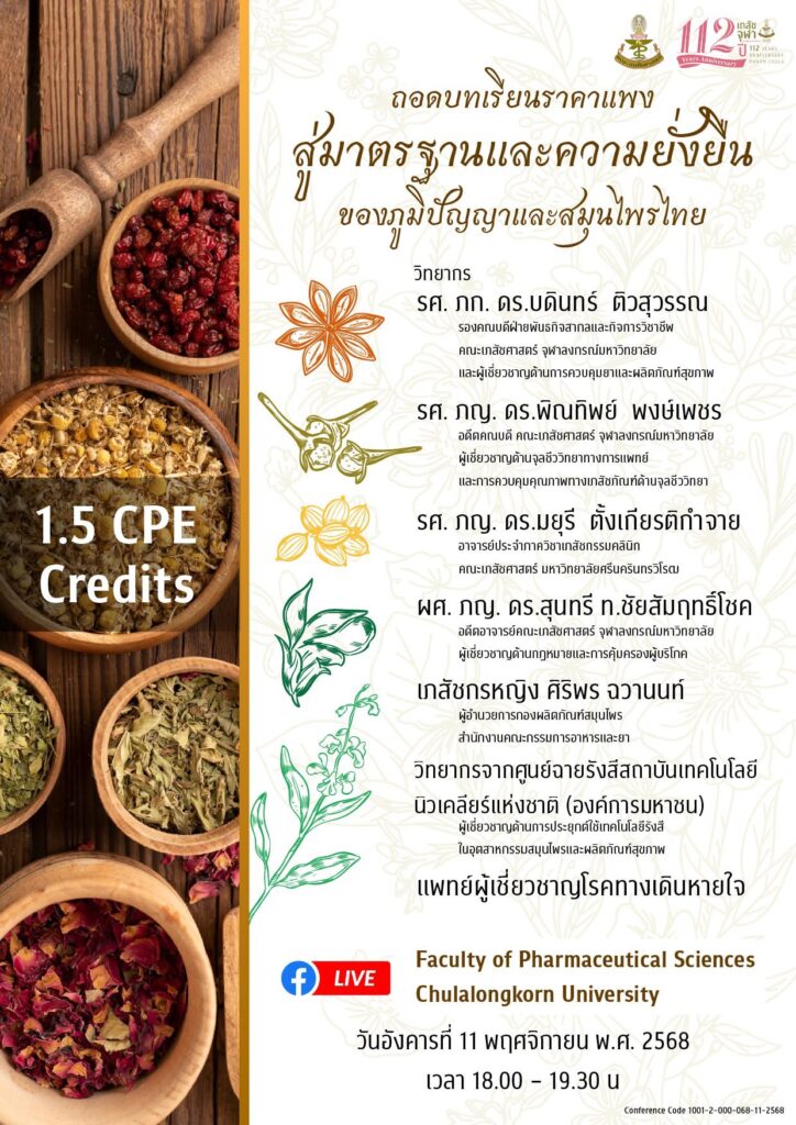 “สมุนไพรไทย” เป็นภูมิปัญญาที่มีคุณค่าและมีบทบาทสำคัญต่อสุขภาพ เศรษฐกิจ และวัฒนธรรมของประเทศ ปัจจุบันมีการใช้สมุนไพรอย่างไม่ถูกต้องหรือขาดมาตรฐานซึ่งก่อให้เกิดผลกระทบต่อสุขภาพและความเชื่อมั่นของประชาชนคณะเภสัชศาสตร์ จุฬาลงกรณ์มหาวิทยาลัยจัดการเสวนาเรื่อง“ถอดบทเรียนราคาแพง สู่มาตรฐานและความยั่งยืนของภูมิปัญญาและสมุนไพรไทย” ในวันอังคารที่ 11 พฤศจิกายน 2568 เวลา 18.30-19.30 น. ผ่าน Facebook Live : Faculty of Pharmaceutical Sciences, Chulalongkorn University เพื่อเปิดเวทีแลกเปลี่ยนความคิดเห็นจากผู้เชี่ยวชาญหลายสาขา ทั้งด้านเภสัชกรรม ด้านการแพทย์ กฎหมาย การคุ้มครองผู้บริโภคและเทคโนโลยีการฉายรังสี เพื่อร่วมกันวิเคราะห์ ทบทวน และเสนอแนวทางการยกระดับสมุนไพรไทยให้มีมาตรฐานความปลอดภัยที่มั่นคง และขับเคลื่อนไปสู่การพัฒนาอย่างยั่งยืนตามทิศทางของประเทศในอนาคต