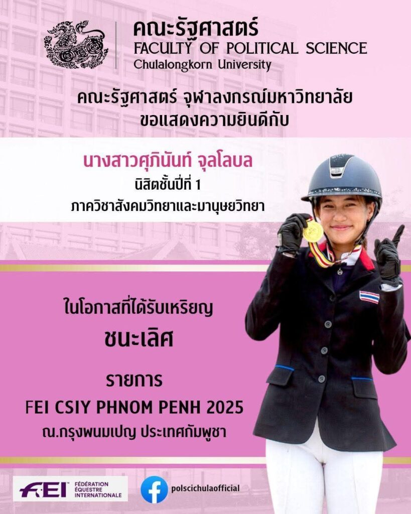 จุฬาลงกรณ์มหาวิทยาลัยขอแสดงความยินดีอย่างยิ่งกับนางสาวศุภินันท์ จุลโลบล นิสิตชั้นปีที่ 1 ภาควิชาสังคมวิทยาและมานุษยวิทยา คณะรัฐศาสตร์ จุฬาฯ สร้างชื่อเสียงให้ประเทศไทยและนำความภาคภูมิใจมาสู่มหาวิทยาลัย คว้ารางวัลชนะเลิศการแข่งขันขี่ม้ากระโดดข้ามเครื่องกีดขวาง รายการ FEI CSIY PHNOM PENH 2025 ซึ่งจัดขึ้นระหว่างวันที่ 1 – 2 พฤศจิกายน 2568 ณ กรุงพนมเปญ ประเทศกัมพูชา มีนักกีฬาจากประเทศต่าง ๆ เข้าร่วมการแข่งขัน ได้แก่ กัมพูชา สาธารณรัฐประชาชนจีน ฮ่องกง อินโดนีเซีย มาเลเซีย ฟิลิปปินส์ สิงคโปร์ และประเทศไทย