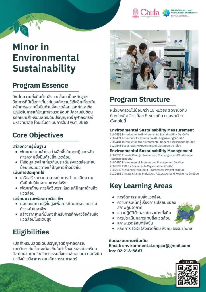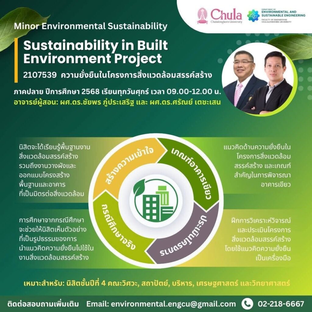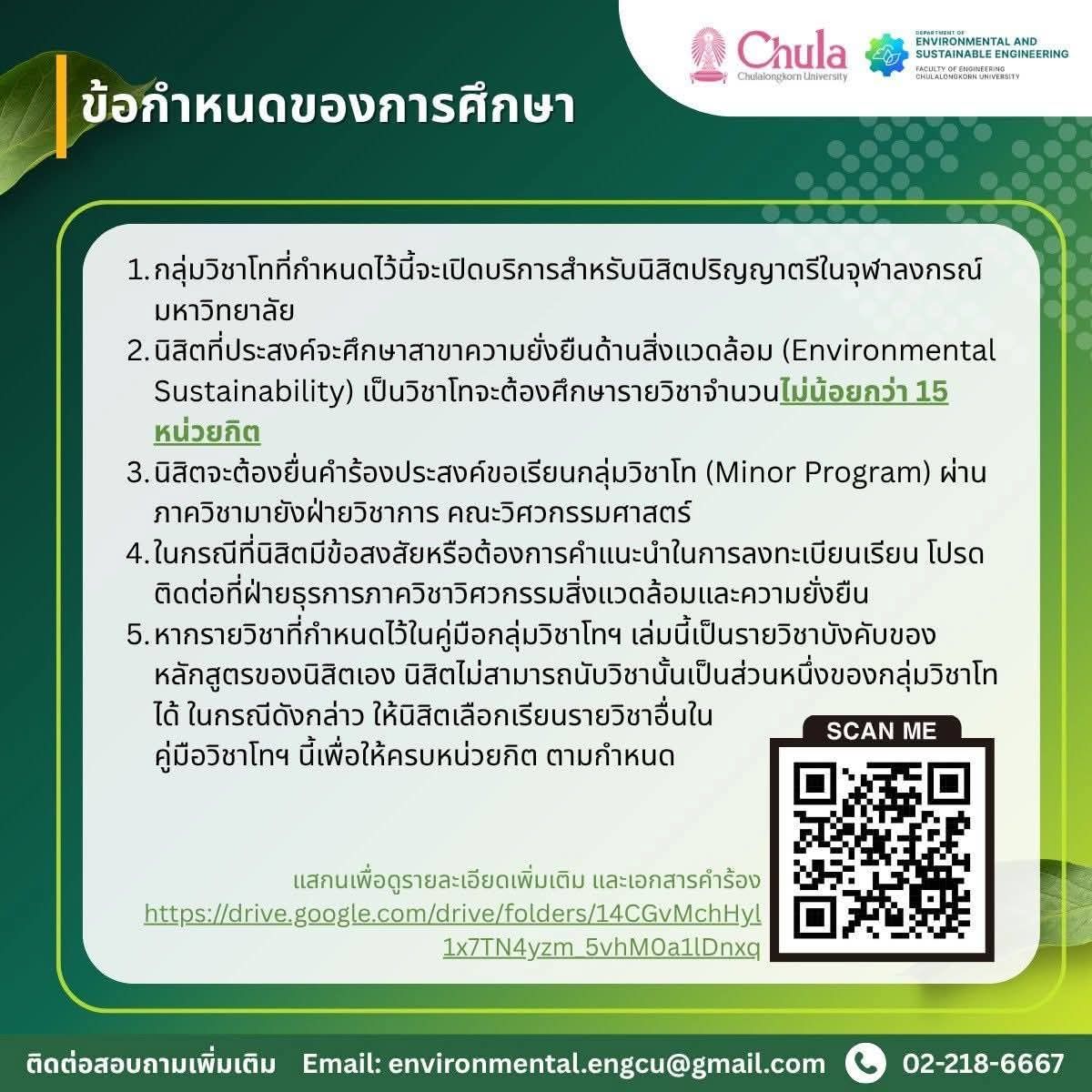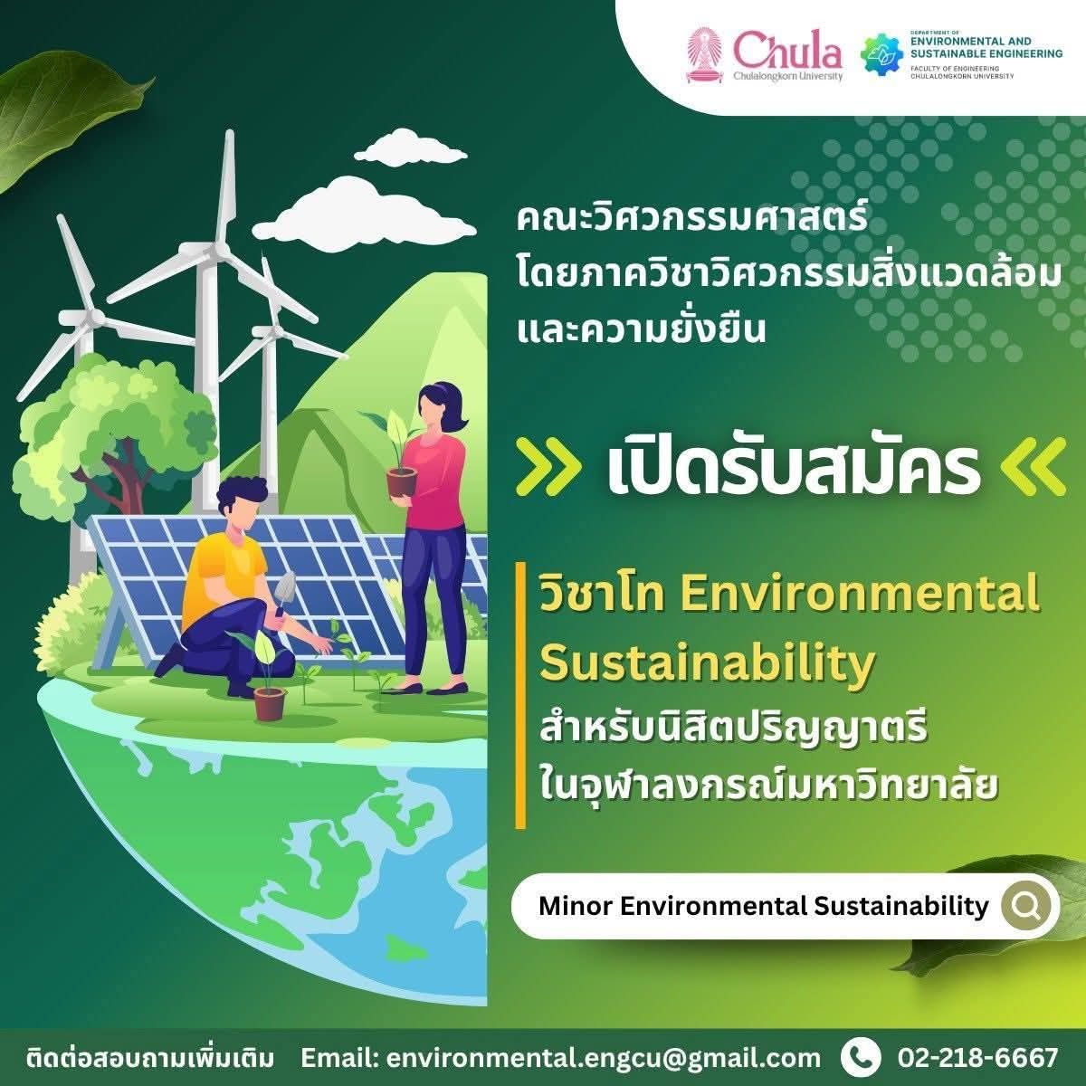ภาควิชาวิศวกรรมสิ่งแวดล้อมและความยั่งยืน คณะวิศวกรรมศาสตร์ จุฬาฯ เปิดกลุ่มรายวิชาโท (Minor Program) สาขาความยั่งยืนทางสิ่งแวดล้อม (Environmental Sustainability) สำหรับนิสิตปริญญาตรีทุกคณะในจุฬาลงกรณ์มหาวิทยาลัย สอนโดยอาจารย์ผู้เชี่ยวชาญและมีชื่อเสียงด้านความยั่งยืนทางสิ่งแวดล้อมในระดับชาติและนานาชาติ