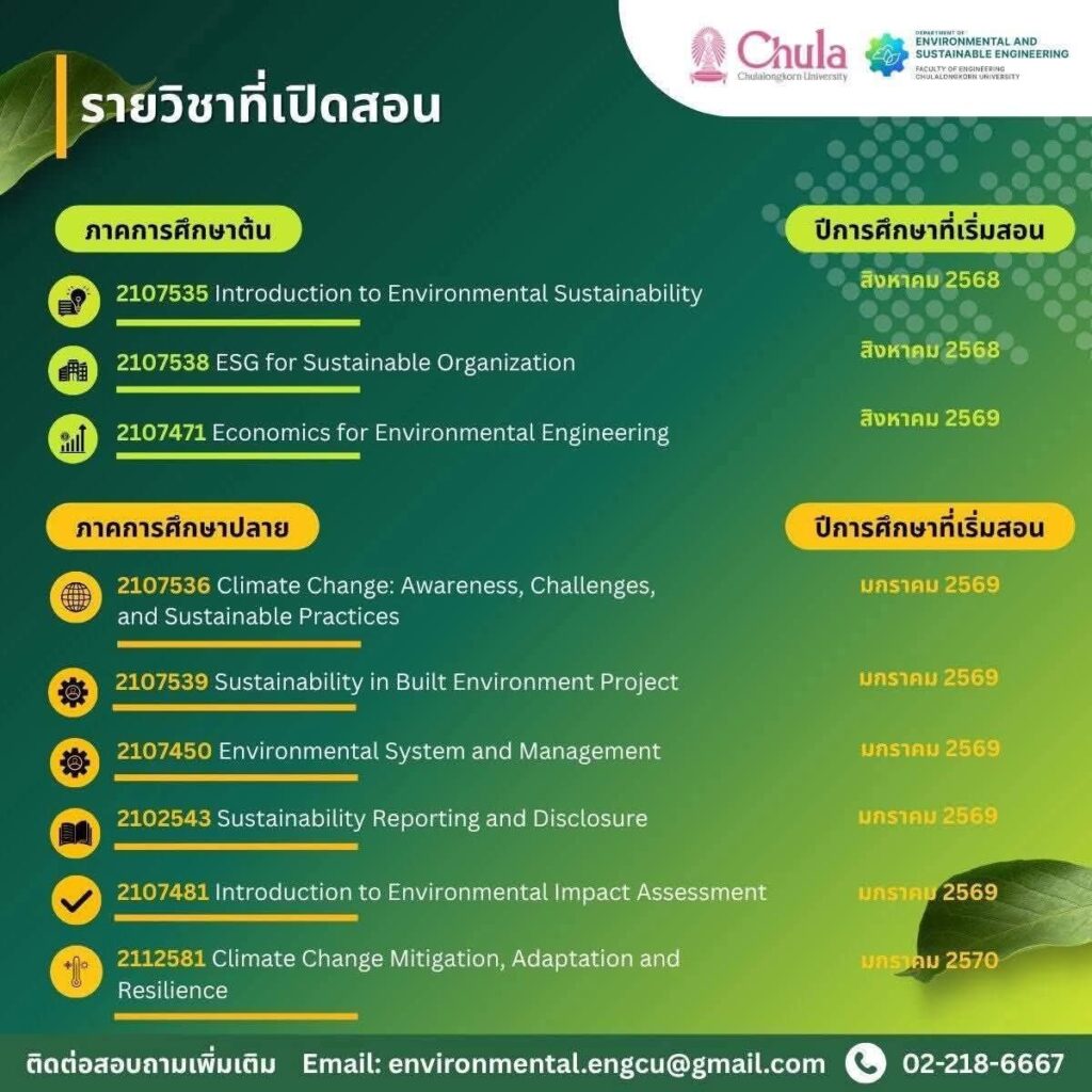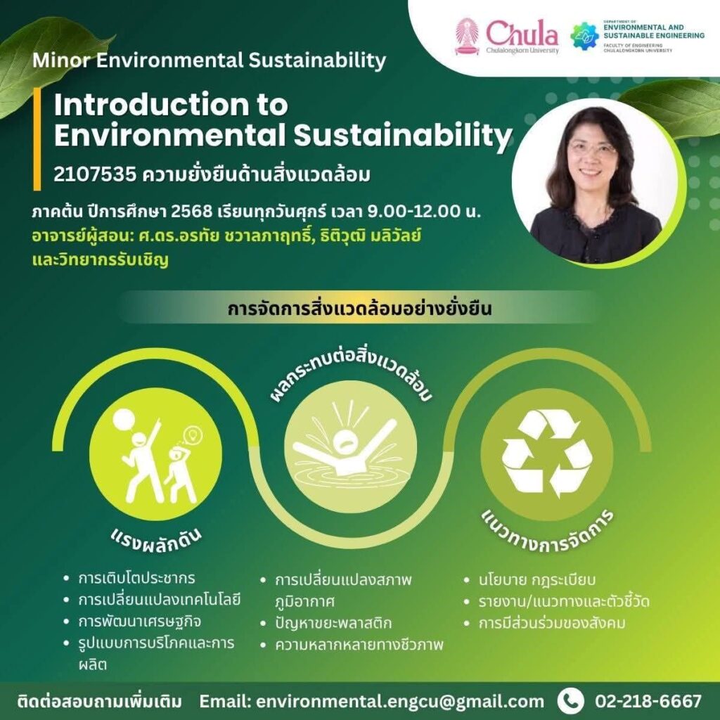 – 2107535 Introduction to Environmental Sustainability (3 หน่วยกิต) สอนโดย ศ.ดร.อรทัย ชวาลภาฤทธิ์ สอนวันศุกร์ 09.00-12.00 น.