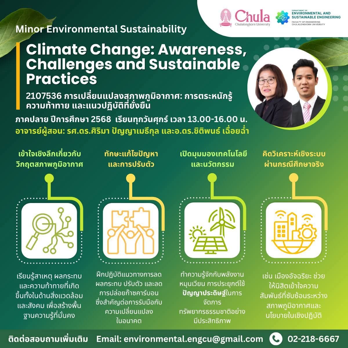 – 2107536 Climate Change: Awareness, Challenges and Sustainable Practices (3 หน่วยกิต) สอนโดย รศ.ดร.ศิริมา ปัญญาเมธีกุล และ อ.ดร.ชิติพนธ์ เฉื่อยฉ่ำ สอนวันศุกร์ 13.00-16.00 น.