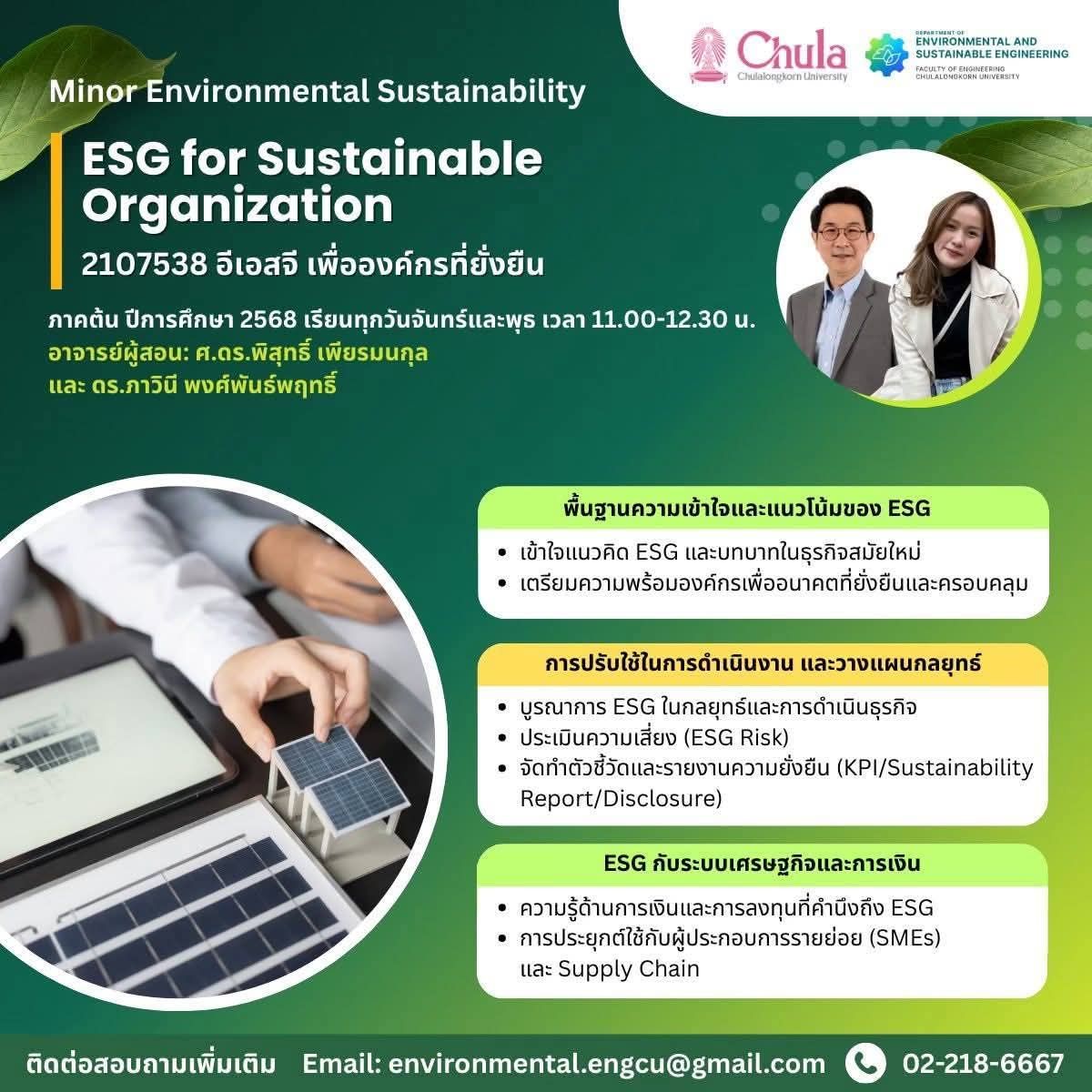 – 2107538 ESG for Sustainable Organization (3 หน่วยกิต) สอนโดย ศ.ดร.พิสุทธิ์ เพียรมนกุล สอนวันจันทร์และพุธ 11.00-12.30 น.