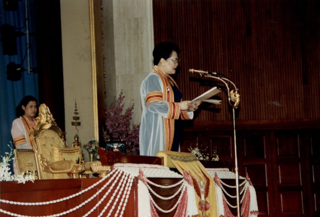 “…วิชาความรู้นั้นถือได้ว่าเป็นเครื่องเชิดชูบุคคลให้งามเด่น เพราะเป็นปัจจัยส่งเสริมให้สามารถสร้างสรรค์ความสำเร็จและชื่อเสียงเกียรติคุณได้ ข้าพเจ้าขอความร่วมมือจากบัณฑิตที่เพิ่งสำเร็จการศึกษาในที่นี้ทุกคน ได้นำความรู้ไปช่วยส่งเสริมชาติของเราให้งามพร้อมทั้งอารยธรรม วัฒนธรรม และจริยธรรม ท่านทั้งหลายเป็นผู้มีอายุยังน้อย เต็มเปี่ยมไปด้วยพลังกายพลังใจ มีความกระตือรือร้นและปรารถนาดีต่อบ้านเมือง ต่อไปก็จะแยกย้ายกันออกไปทำงานอยู่ในหน่วยงานต่างๆ ทั้งภาครัฐบาลและภาคเอกชนทั่วทุกภูมิภาค หากท่านทั้งหลายร่วมมือกันช่วยเหลือเกื้อกูลชาติ ข้าพเจ้าเชื่อว่าภายหน้า บ้านเมืองของเราคงจะมีทั้งความสุขความเจริญยิ่งขึ้น…”