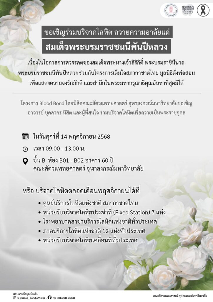 โครงการ Blood Bond โดยนิสิตคณะสัตวแพทย์ จุฬาลงกรณ์มหาวิทยาลัย ร่วมกับโครงการเต็มใจ สภากาชาดไทย มูลนิธิดั่งพ่อสอน ขอเชิญร่วมบริจาคโลหิตเพื่อเป็นพระราชกุศล เนื่องในโอกาสการสวรรคตสมเด็จพระนางเจ้าสิริกิติ์ พระบรมราชินีนาถ พระบรมราชชนนีพันปีหลวง ณ ศูนย์บริการโลหิตแห่งชาติ สภากาชาดไทย ตลอดเดือนพฤศจิกายนนี้ และในวันศุกร์ที่ 14 พฤศจิกายน 2568 เวลา 09.00 – 13.00 น. ณ อาคาร 60 ปี ชั้น B ห้อง B01-B02 คณะสัตวแพทยศาสตร์ จุฬา ฯ