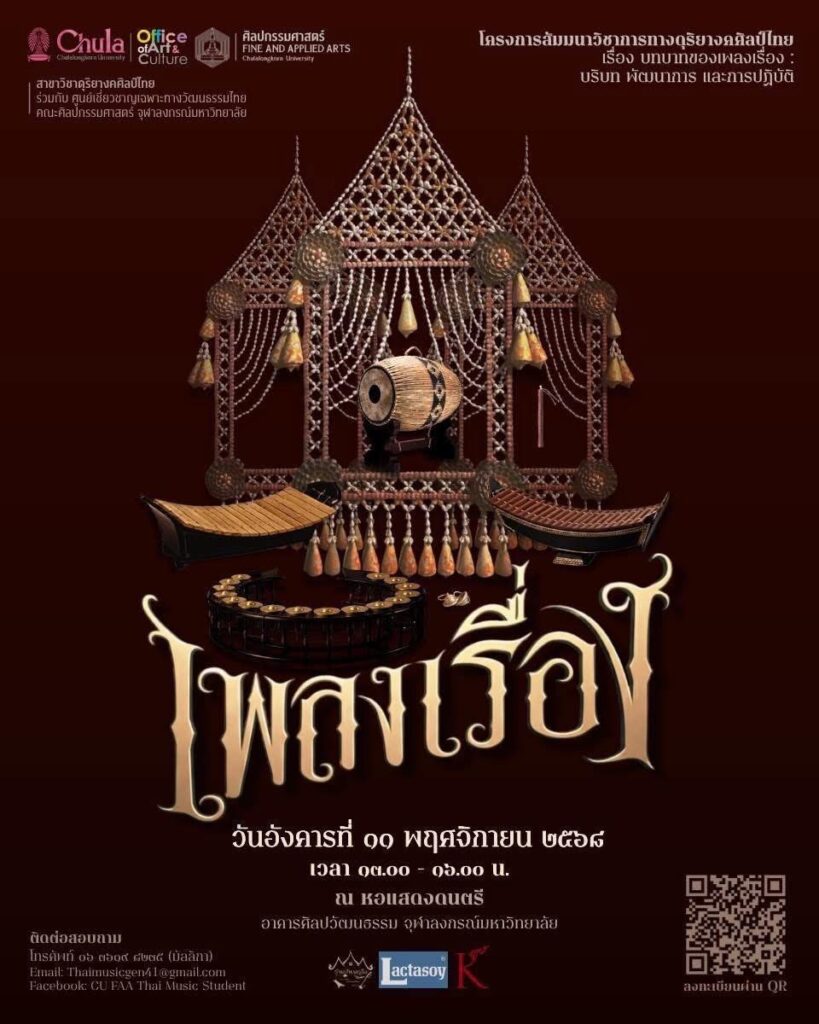 ศ.ดร.ขำคม พรประสิทธิ์ คณบดีคณะศิลปกรรมศาสตร์ จุฬาฯ เป็นประธานกล่าวเปิดโครงการสัมมนาวิชาการทางดุริยางคศิลป์ไทย เรื่อง “บทบาทของเพลงเรื่อง : บริบท พัฒนาการ และการปฏิบัติ” และได้รับเกียรติจาก อ.ดร.สิริชัย ชาญฟักจำรูญ ศิลปินแห่งชาติ และศิลปินประจำมหาวิทยาลัย เป็นประธานจุดธูปเทียนบูชาครูในพิธีเปิดโครงการสัมมนา โดยความร่วมมือระหว่างคณะศิลปกรรมศาสตร์ สำนักบริหารศิลปวัฒนธรรม และศูนย์เชี่ยวชาญวัฒนธรรมดนตรีไทย จุฬาลงกรณ์มหาวิทยาลัย เมื่อวันอังคารที่ 11 พฤศจิกายน 2568 ณ หอแสดงดนตรี อาคารศิลปวัฒนธรรม จุฬาฯ