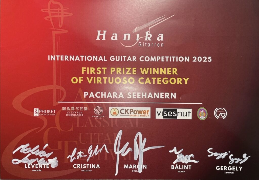 นายพชร สีหะเนิน นิสิตชั้นปีที่ 4 สาขาวิชาดุริยางคศิลป์ตะวันตก คณะศิลปกรรมศาสตร์ จุฬาฯ นิสิตภายใต้การสอนของ อ.ร.อ.ดร.ดนุเชษฐ วิสัยจร ได้รับรางวัลชนะเลิศ อันดับที่ 1 (Virtuoso Category-1st Prize) จากการแข่งขัน Hanika International Guitar Competition 2025 ซึ่งจัดขึ้นระหว่างวันที่ 14–16 พฤศจิกายน 2568 ณ สมาคมธรรมศาสตร์ ในพระบรมราชูปถัมภ์