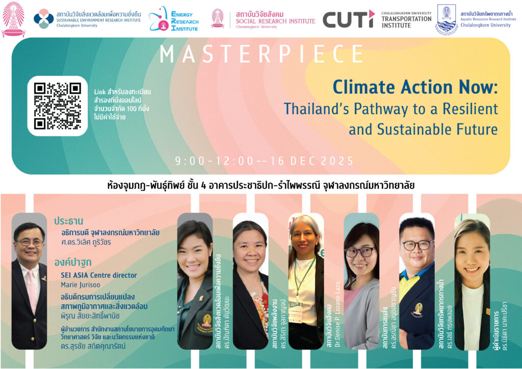 จุฬาลงกรณ์มหาวิทยาลัย โดยความร่วมมือของ 5 สถาบัน ได้แก่ สถาบันวิจัยสิ่งแวดล้อมเพื่อความยั่งยืน (SERI) สถาบันวิจัยพลังงาน (ERI) สถาบันวิจัยสังคม (CUSRI) สถาบันการขนส่ง (CUTi) และ สถาบันวิจัยทรัพยากรทางน้ำ (ARRI) ขอเชิญผู้สนใจเข้าร่วมงานเสวนา M A S T E R P I E C E หัวข้อ Climate Action Now: Thailand’s Pathway to a Resilient and Sustainable Future ในวันที่ 16 ธันวาคม 2568 เวลา 09.00 – 12.00 น. ณ ห้องประชุมจุมภฏ-พันธุ์ทิพย์ ชั้น 4 อาคารประชาธิปก – รำไพพรรณี จุฬาลงกรณ์มหาวิทยาลัย