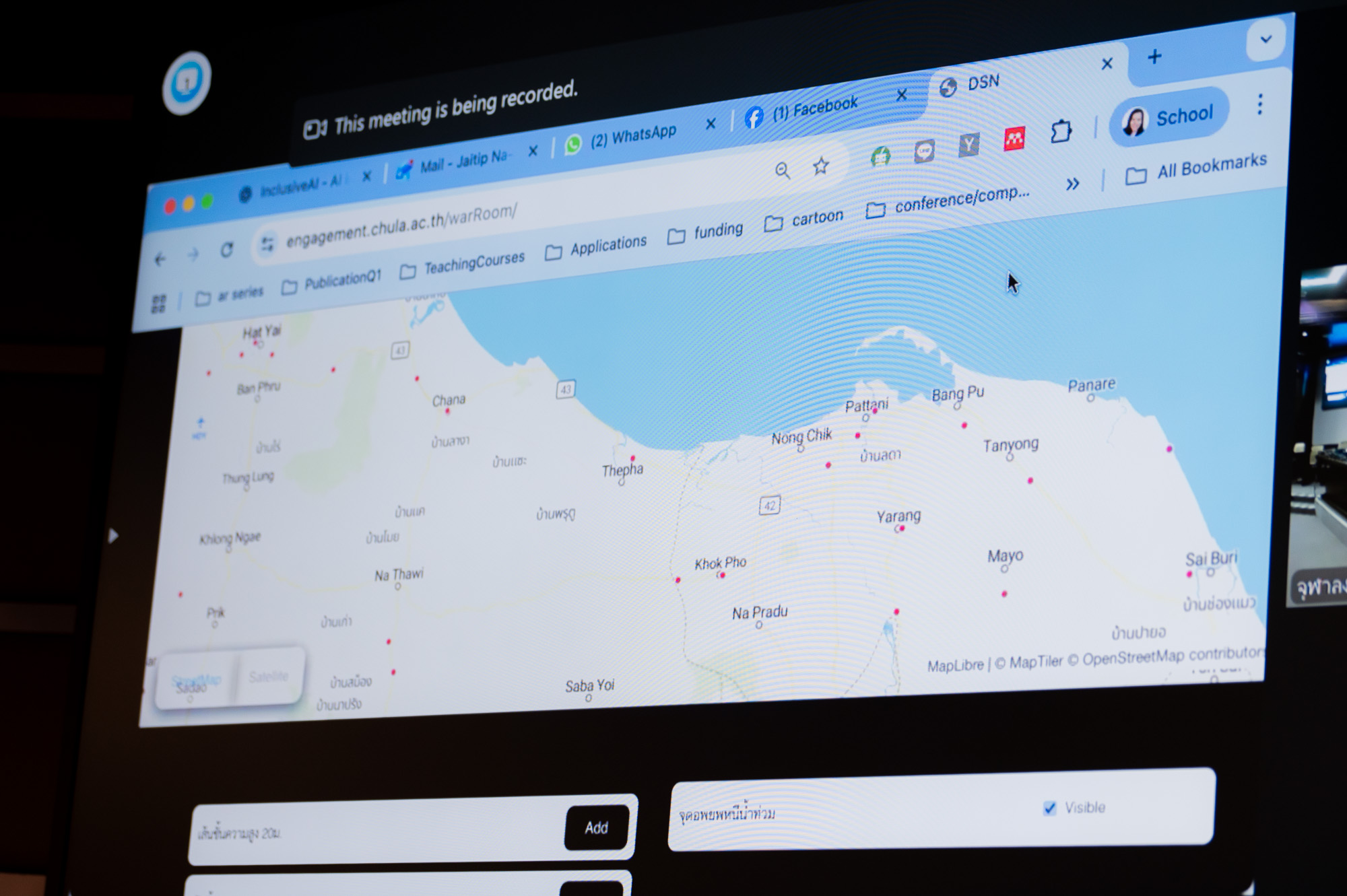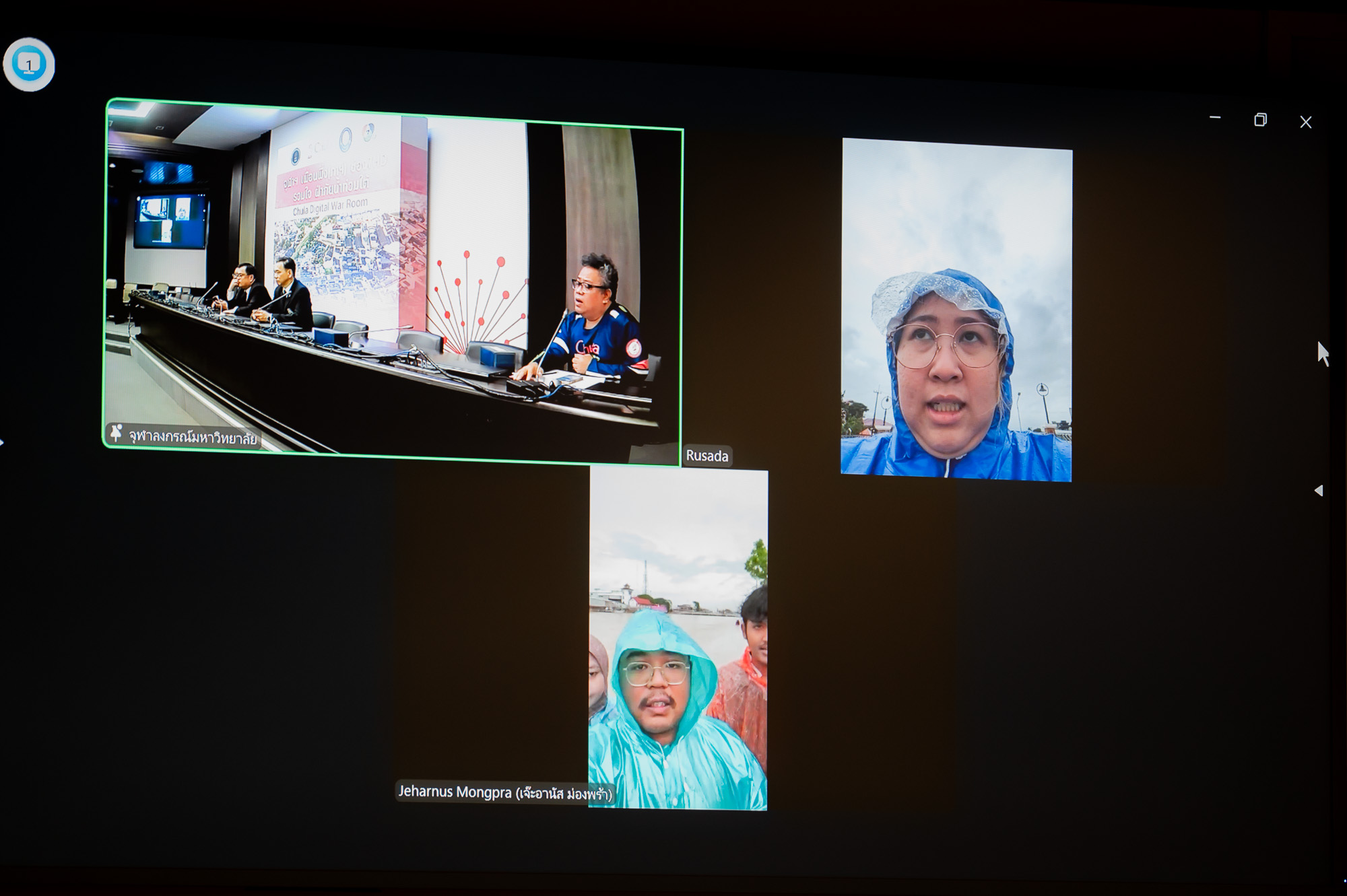 ภายในงาน ศ.ดร.สันติ ภัยหลบลี้ อาจารย์ภาควิชาธรณีวิทยา คณะวิทยาศาสตร์ จุฬาฯ ร่วมสาธิตการใช้งาน Chula Digital War Room เพื่อประสานงานช่วยเหลือผู้ประสบอุทกภัยในภาคใต้ในด้านต่าง ๆ ซึ่งรวมถึง การให้คำปรึกษาในการดูแลฟื้นฟูสุขภาพกาย สุขภาพใจ สุขภาพสัตว์เลี้ยง ฟื้นฟูที่อยู่อาศัยและการออกแบบเมือง